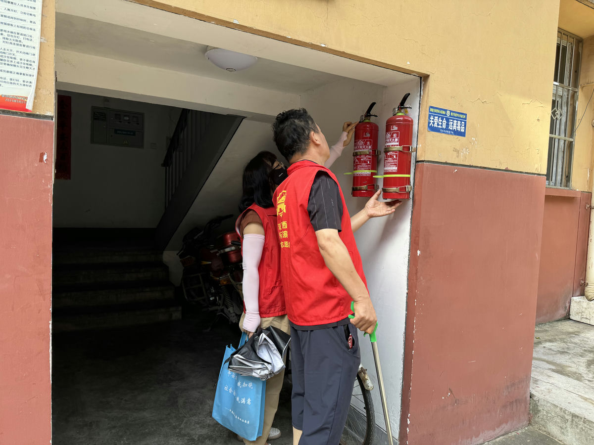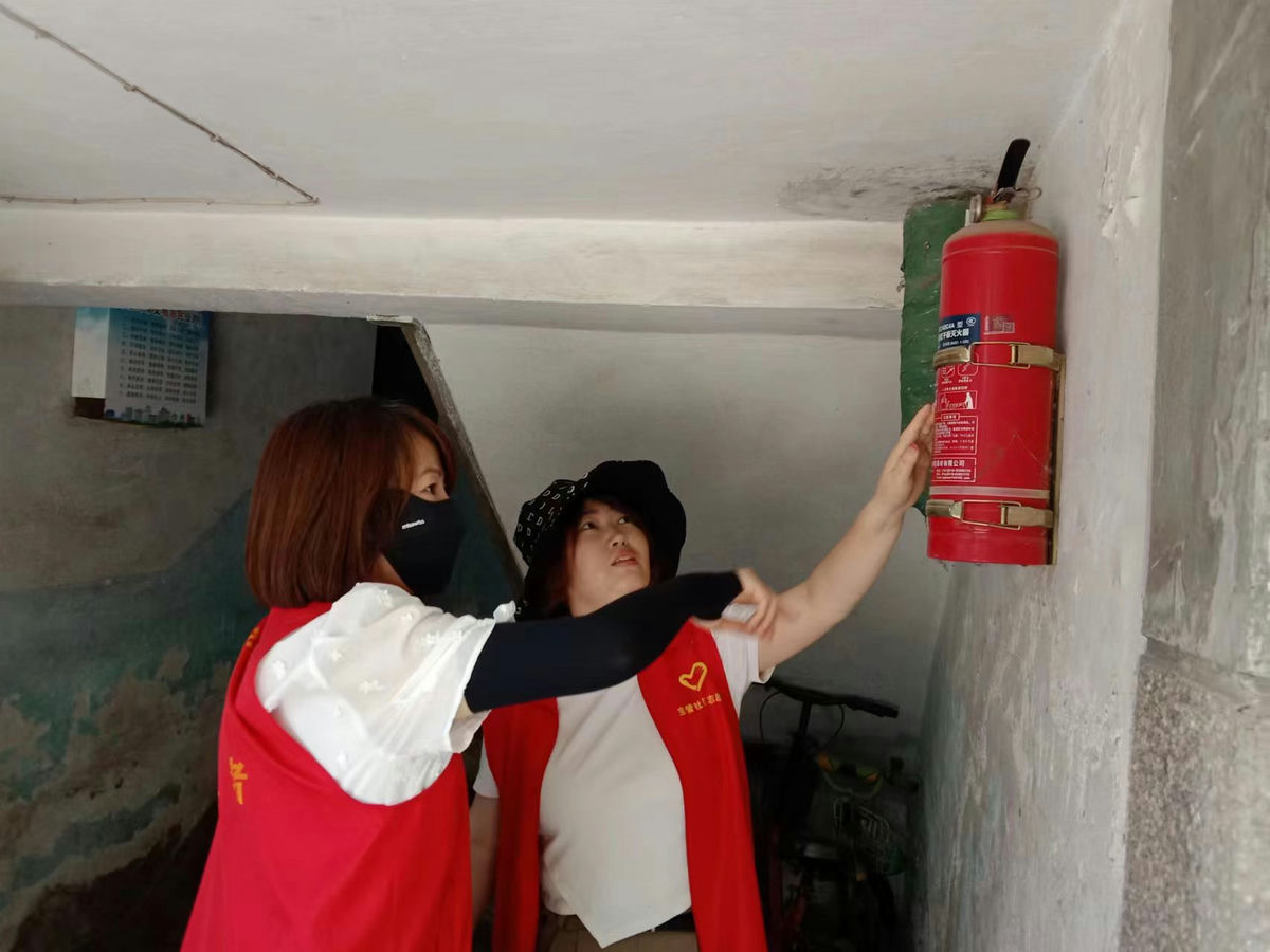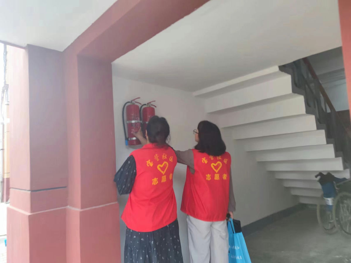 社区组织志愿者对卫校家属院进行消防安全检查、雨后汛情检查,同时进行环境卫生整治活动。