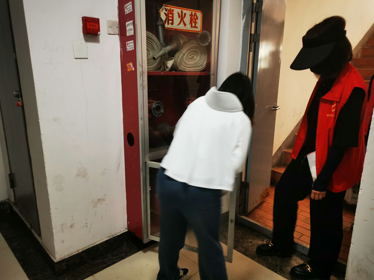社区工作人员检查消防器材,保障居民安全,感谢!