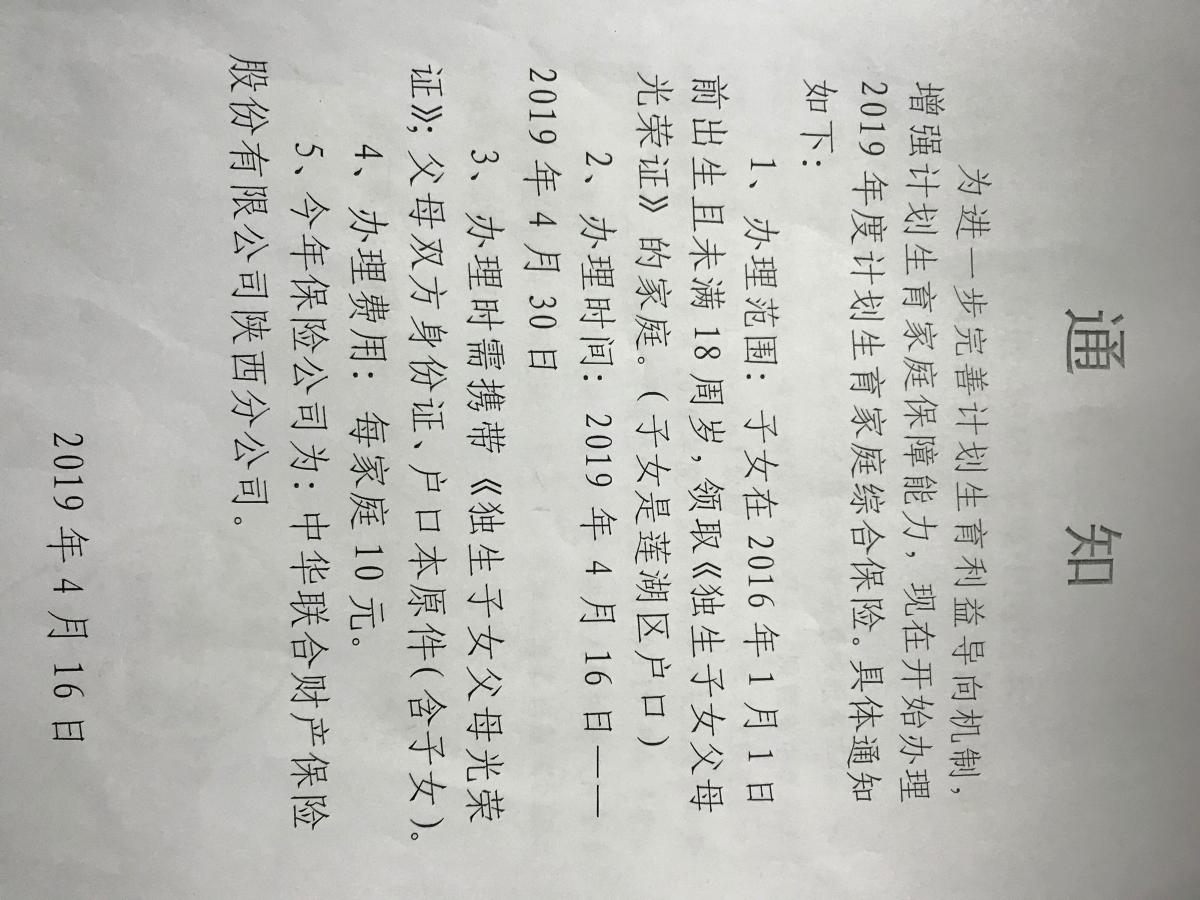 2019年度独生子女家庭综合保险开始办理