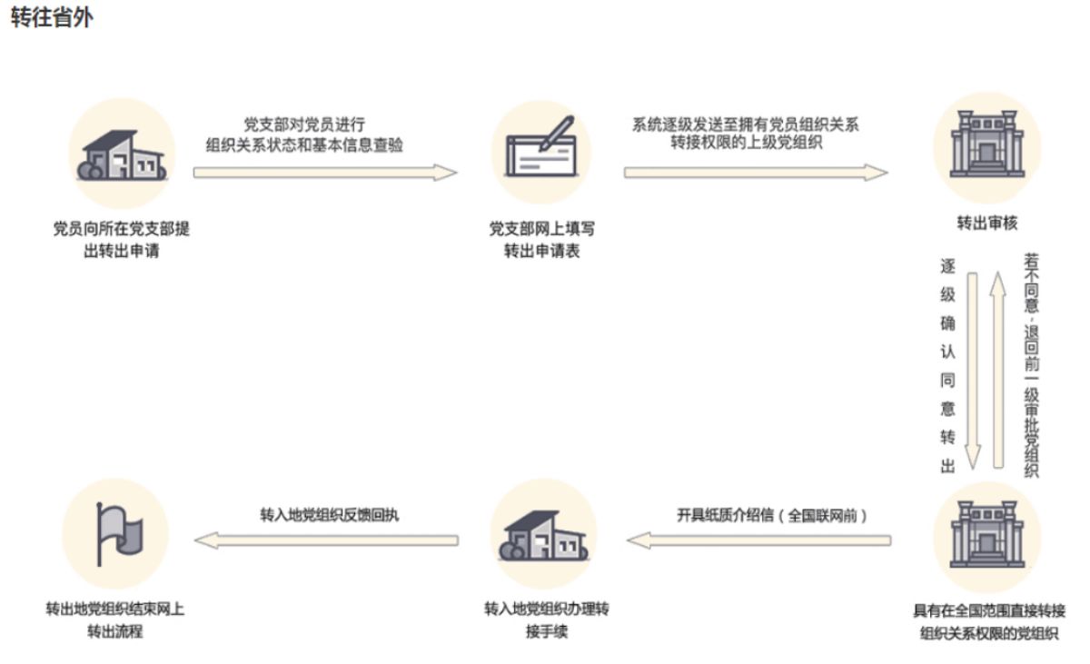 5.拥有党员组织关系转接权限的上级党组织逐级确认同意转出后,党员按照转入地的要求,在有效期内尽快办理落实组织关系。