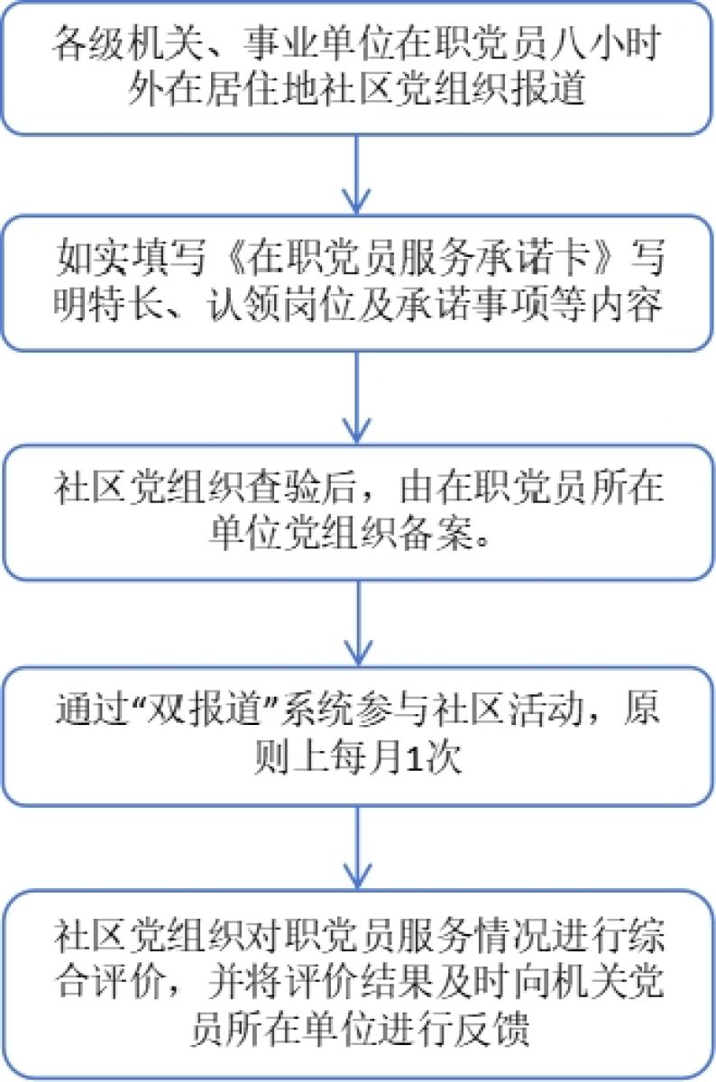 为充分发挥在职党员参与社区建设、服务群众的先锋模范作用,畅通为民服务“最后一公里”,全市各级机关、国有企业、高等院校及其他事业单位在职党员在八小时之外实行“在社区报到的双重管理制度”,八大小时以外自觉服从居住地党组织的管理和监督,积极带头参加社区党组织各类活动,倡导非公有制经济组织和社会组织等其他领域在职党员积极参与。