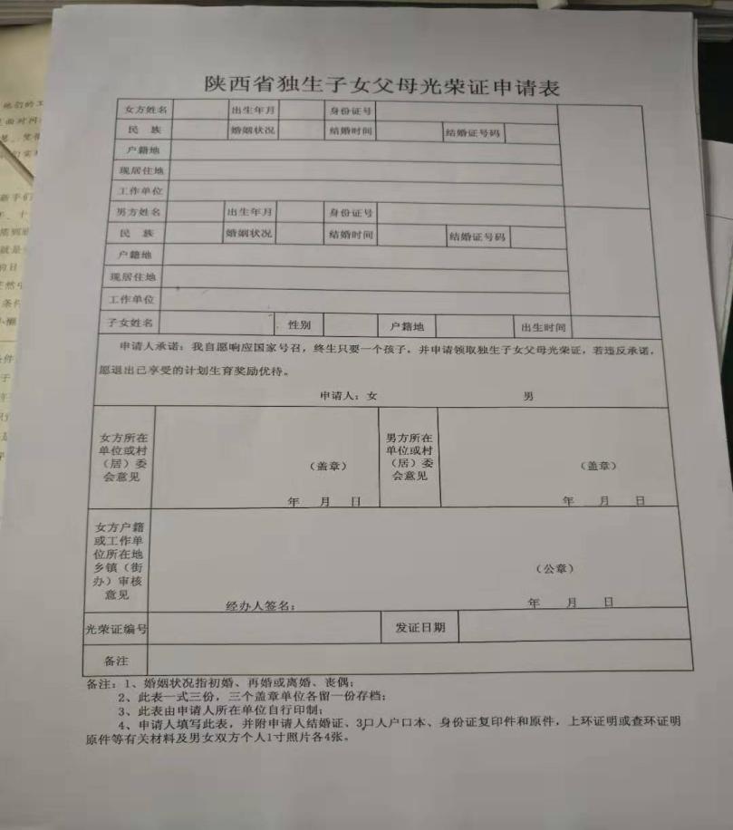 3、材料要求:夫妻双方身份证复印件1份 纸质,户口本复印件1份 纸质,结婚证复印件1份 纸质,出生医学证明复印件1份 纸质,陕西省独生子女父母光荣证申请表原件3份 纸质,上环证明原件1份纸质,夫妻双方一寸照片原件3份纸质。