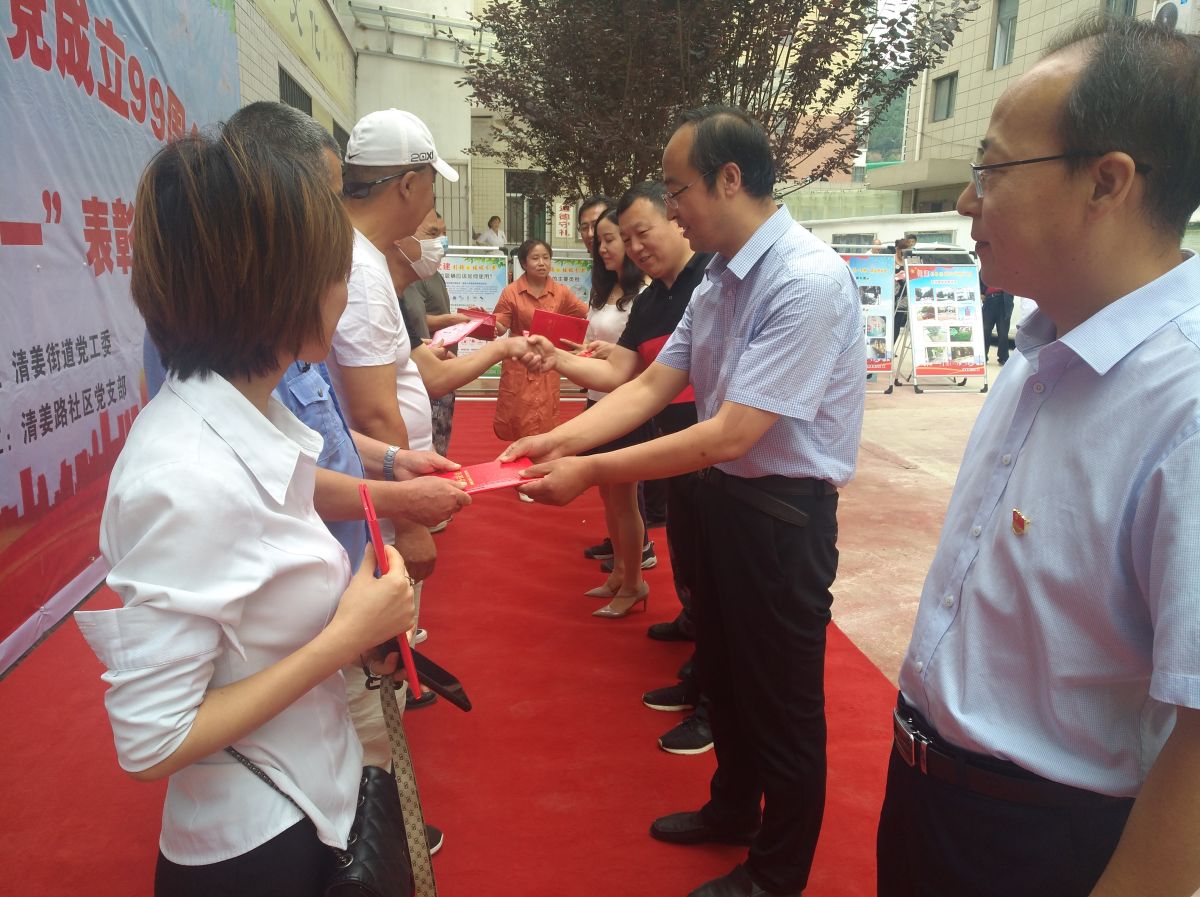 为庆祝中国共产党成立99周年,讴歌党的丰功伟绩,激励辖区广大党员干部增强践行习近平新时代中国特色社会主义思想和党的十九届四中全会精神的思想自觉和行动自觉,坚决贯彻落实习近平总书记来陕调研重要讲话精神和党中央决策部署,表彰新冠疫情防控期间表现突出的党员、居民志愿者,2020年7月1日上午九时,清姜路社区党支部隆重召开纪念中国共产党成立99周年暨“庆七一”表彰大会。
