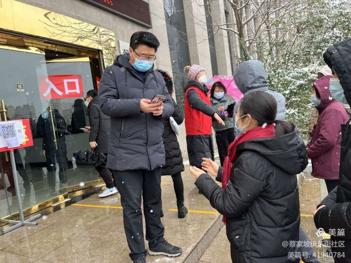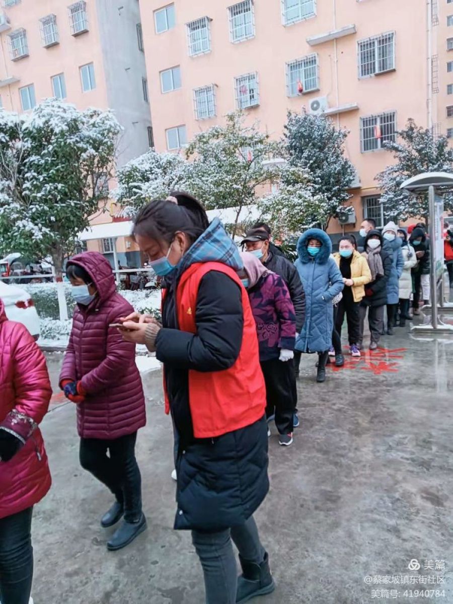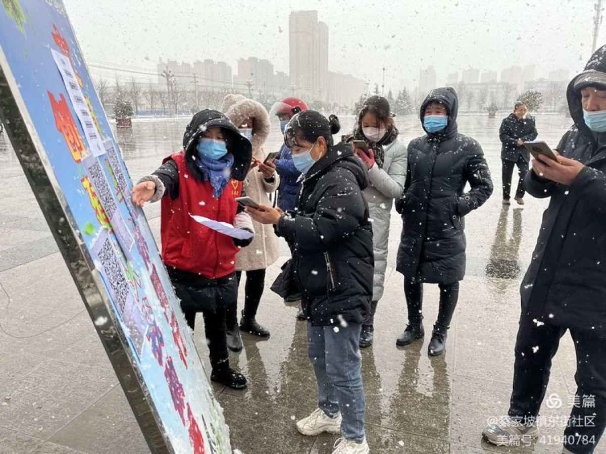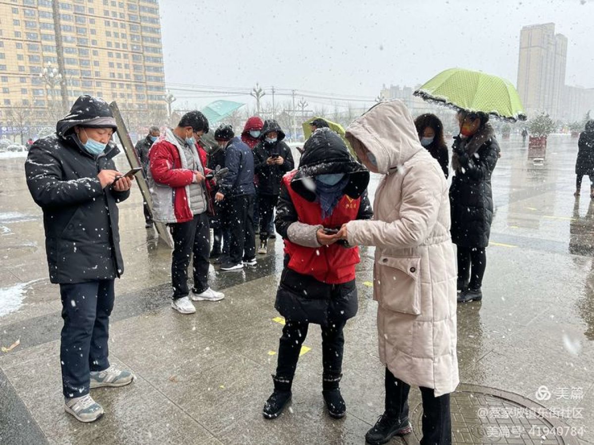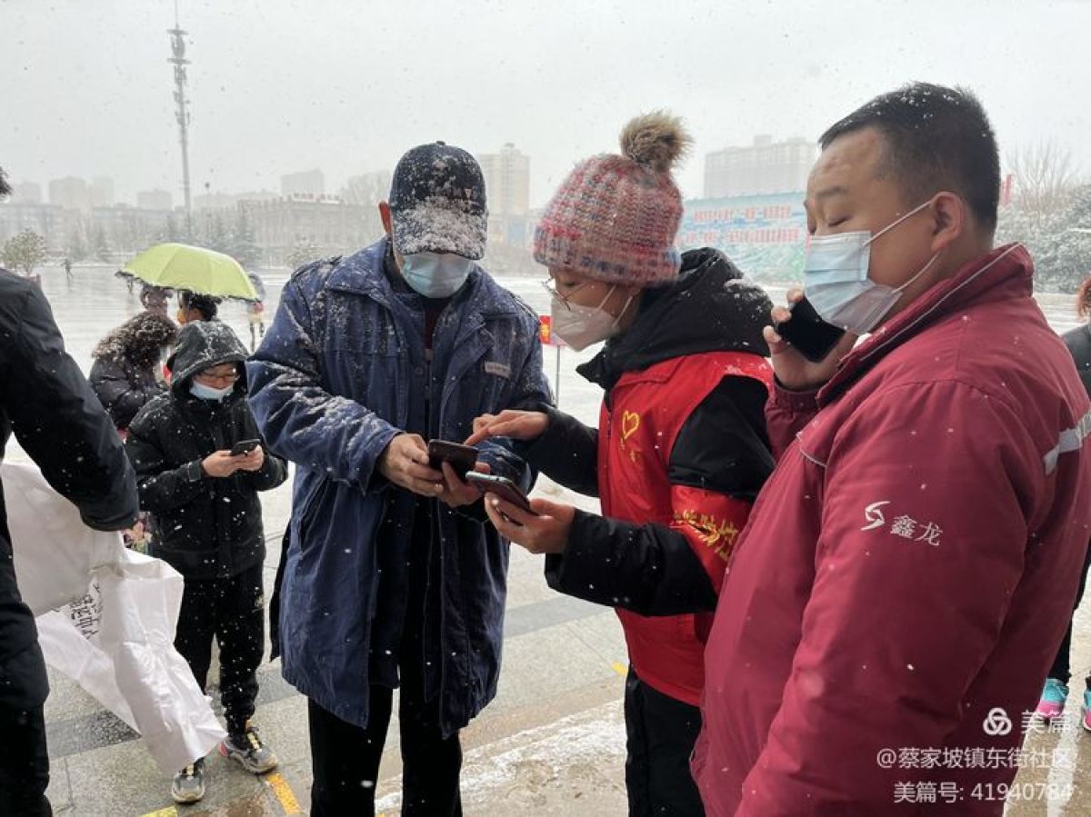 大雪纷飞中,社区工作人员耐心指引居民进行信息注册,确保核酸采样有序进行。