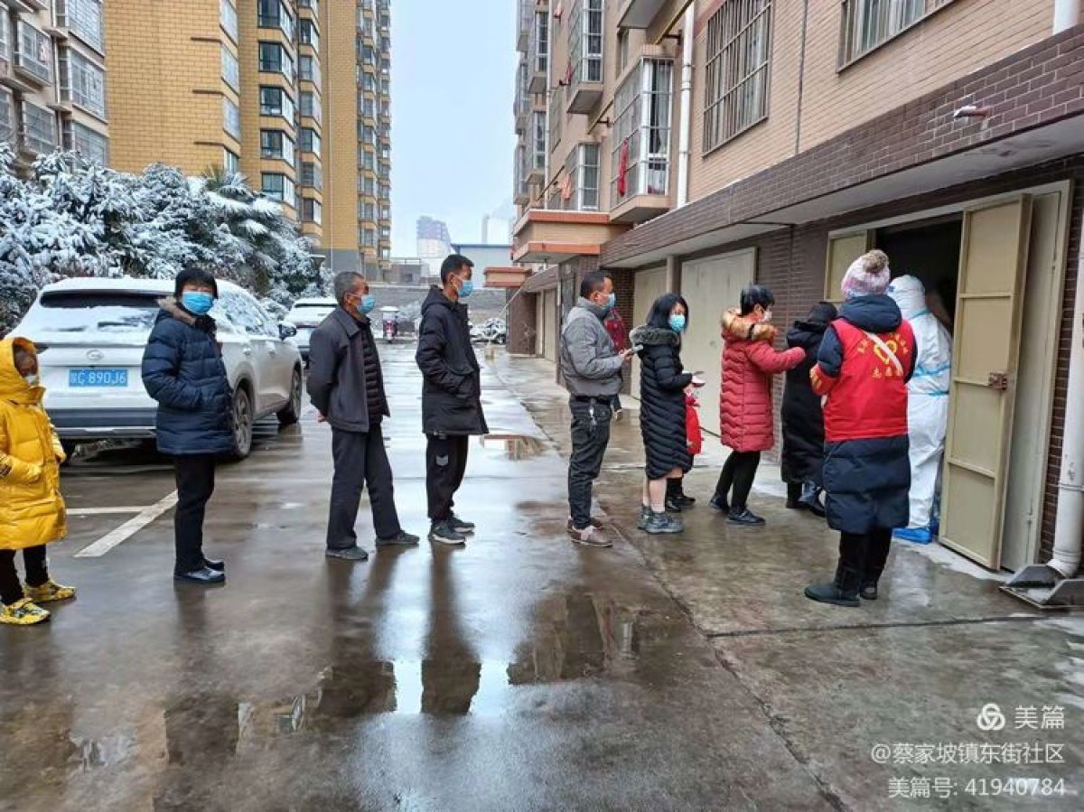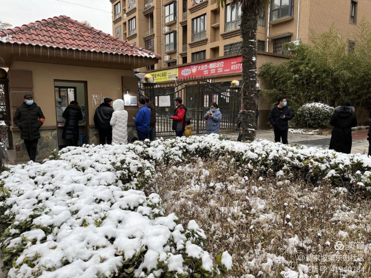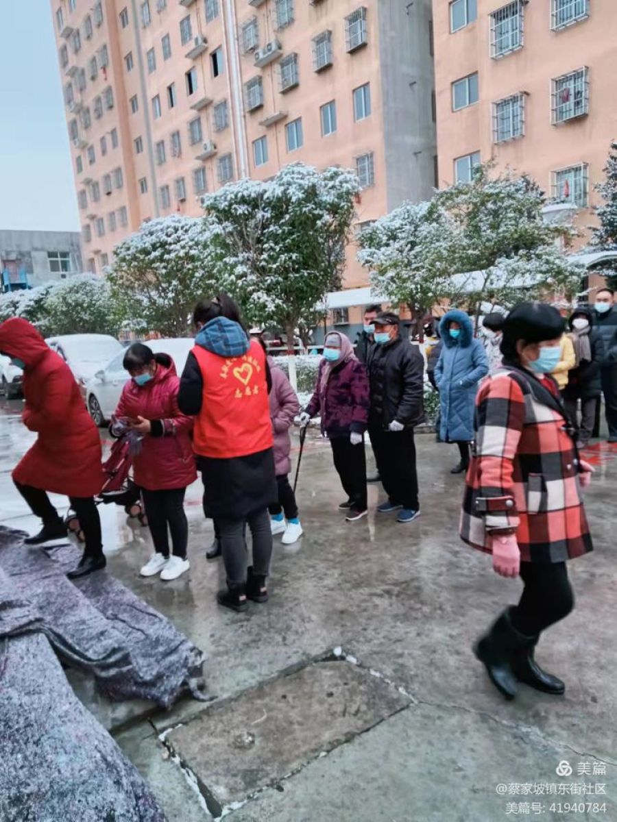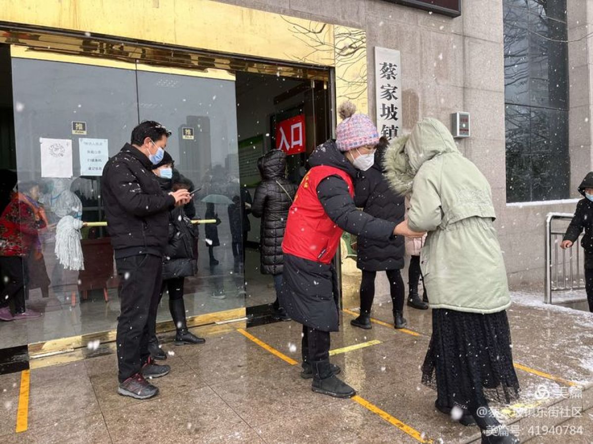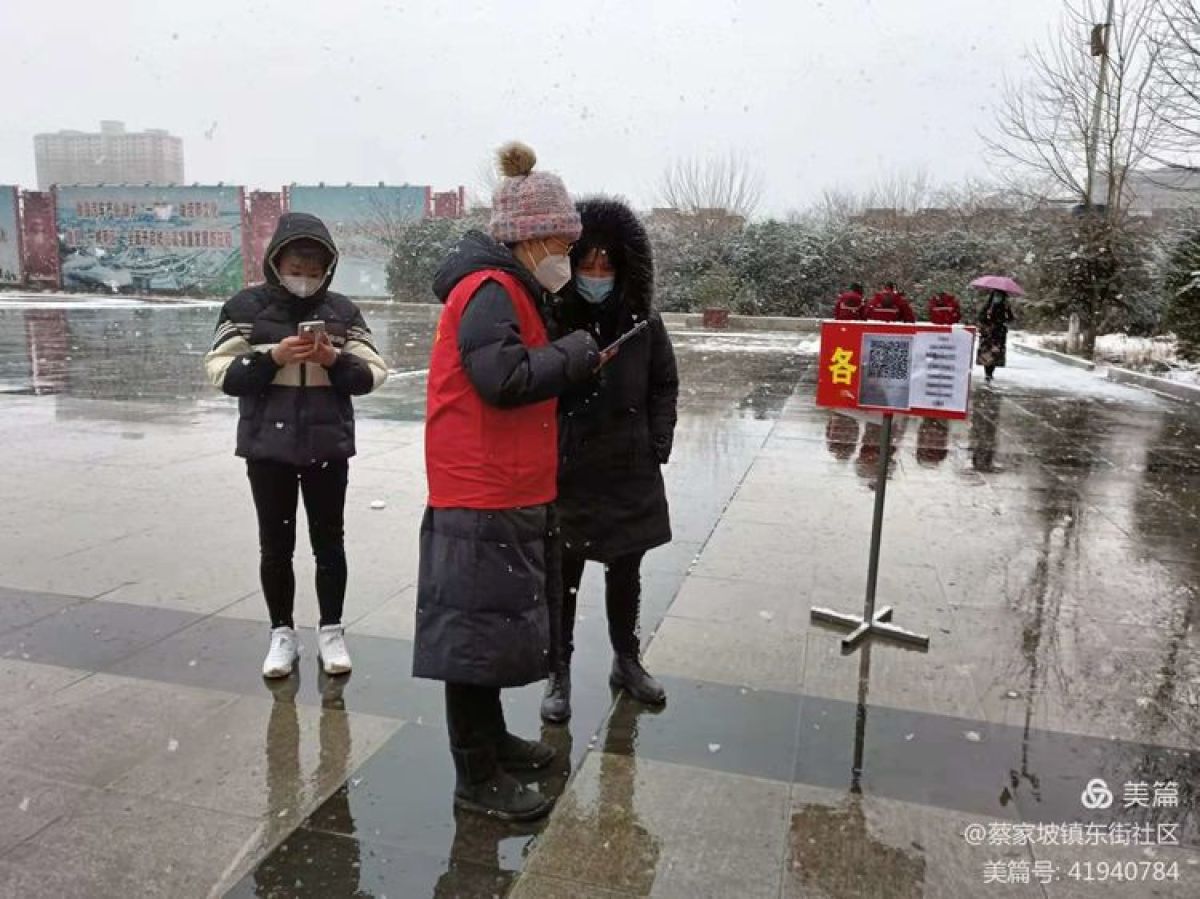 大雪纷飞中,社区工作人员耐心指引居民进行信息注册,确保核酸采样有序进行。