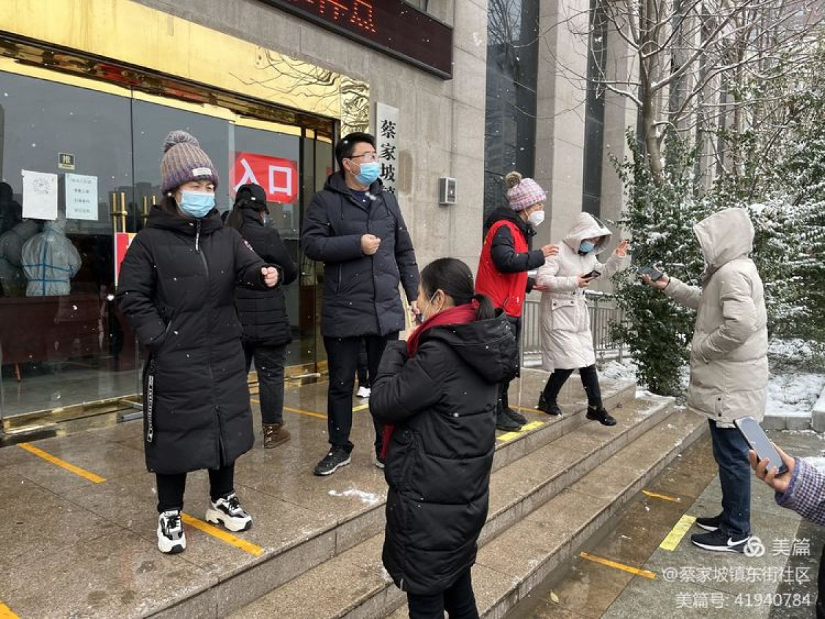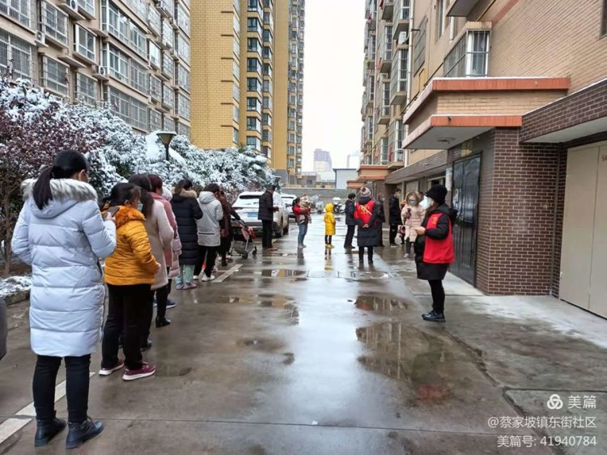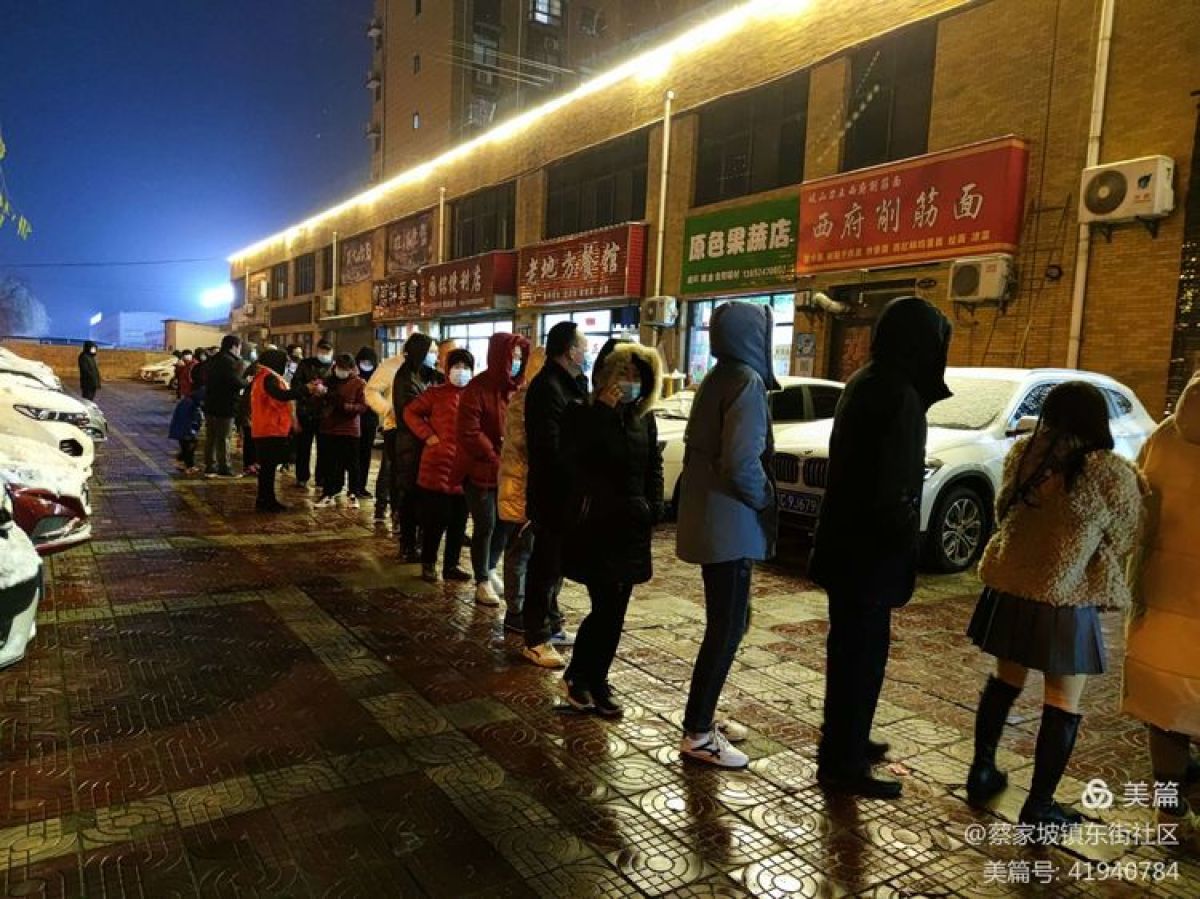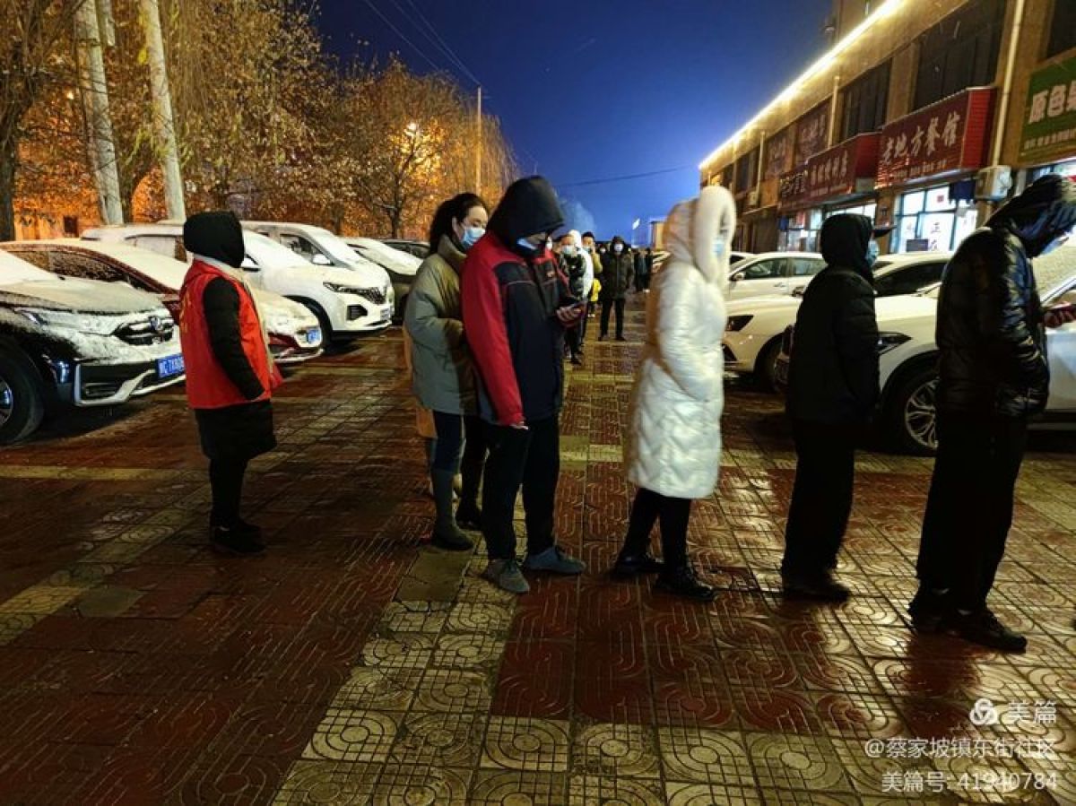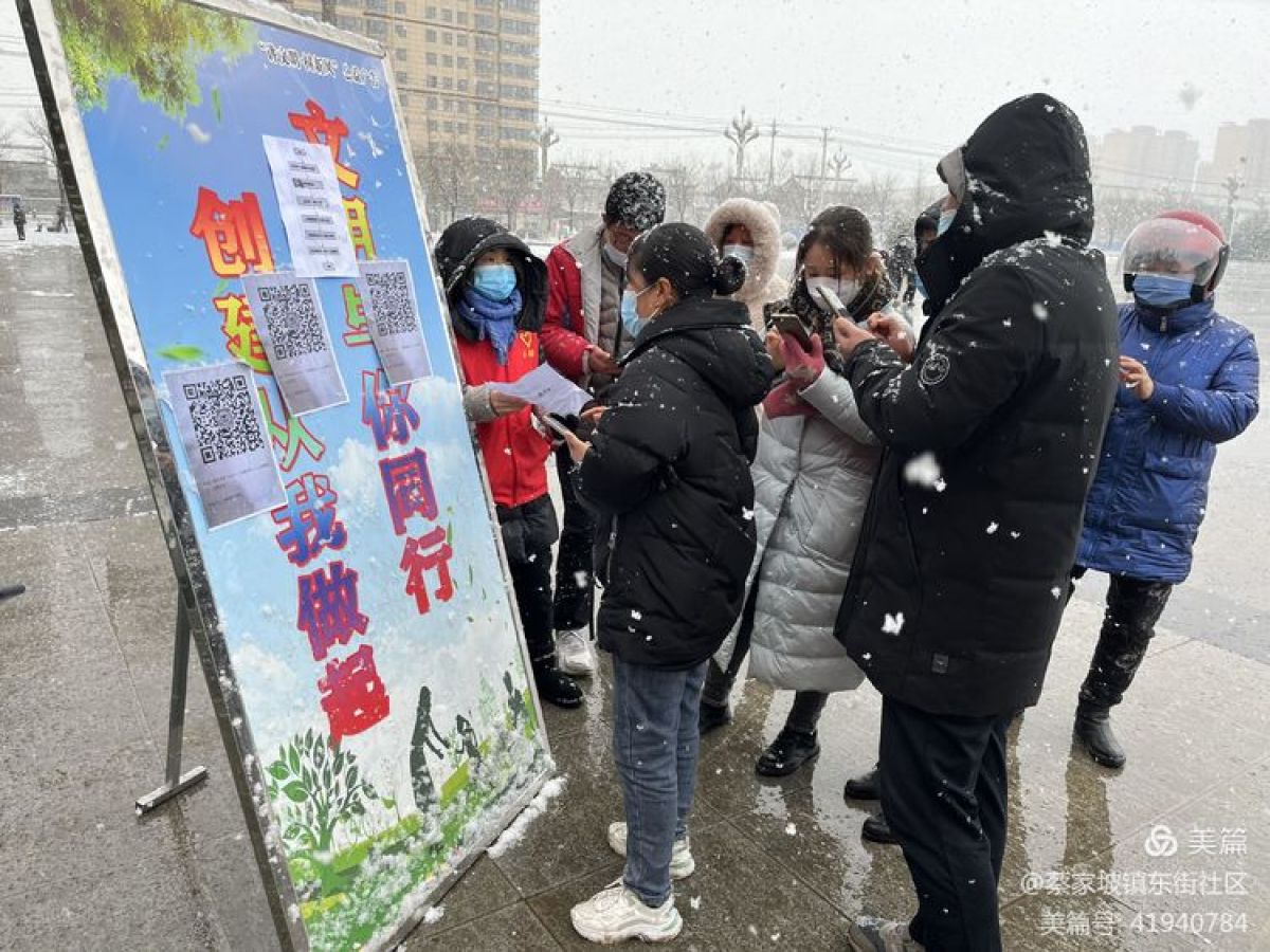 大雪纷飞中,社区工作人员耐心指引居民进行信息注册,确保核酸采样有序进行。
