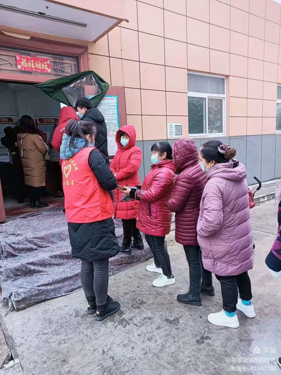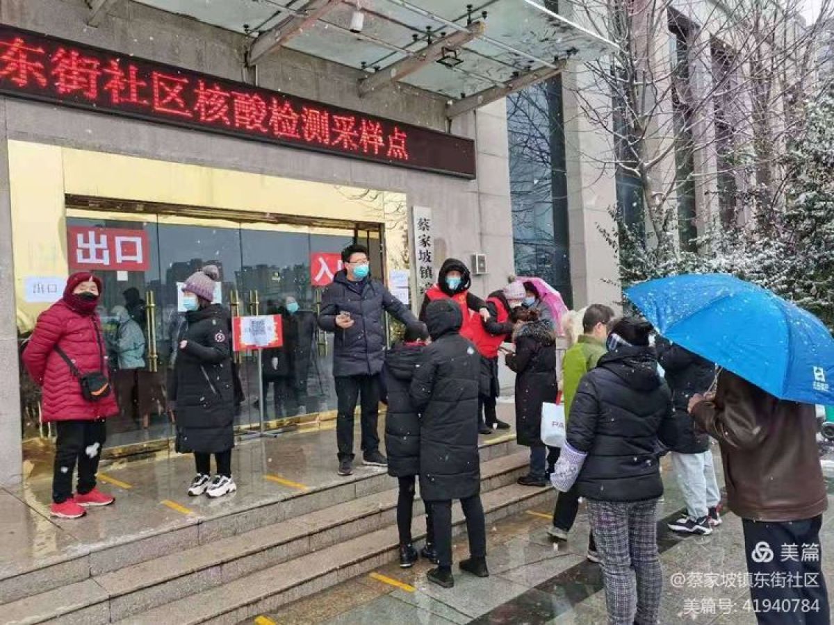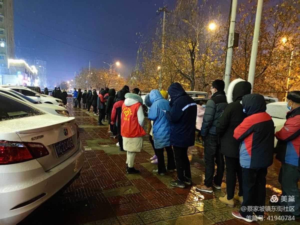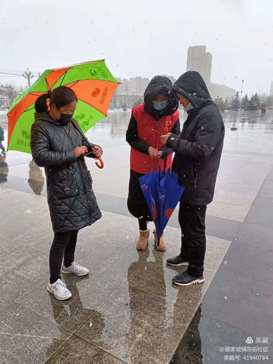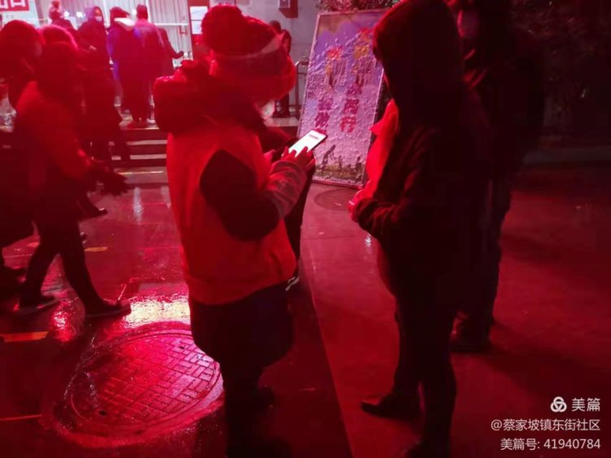 大雪纷飞中,社区工作人员耐心指引居民进行信息注册,确保核酸采样有序进行。