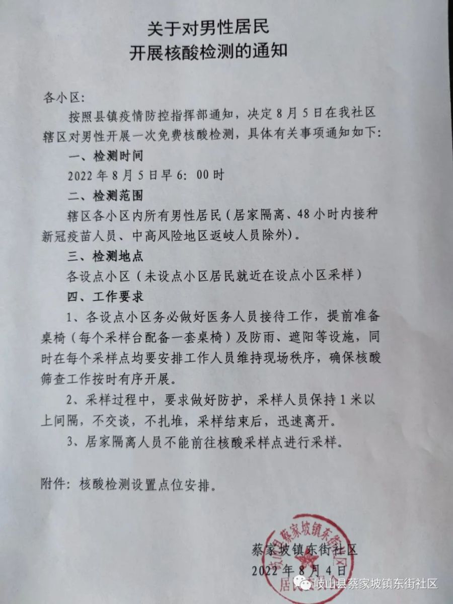 关于开展男性居民核酸检测工作的通知