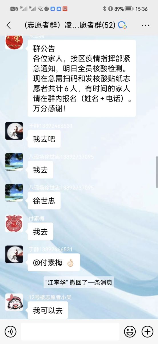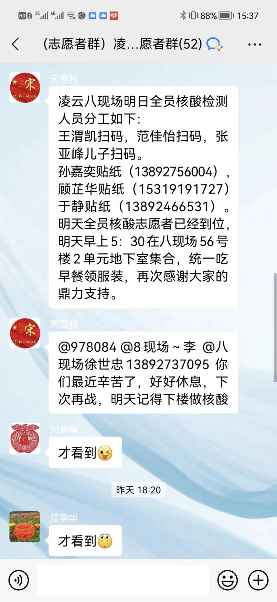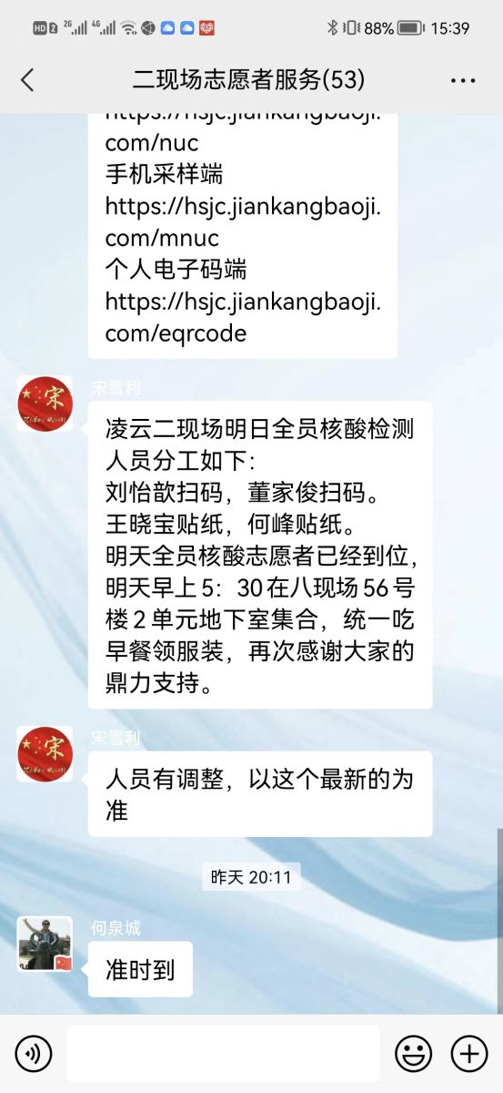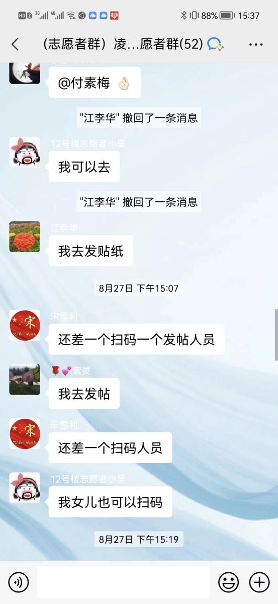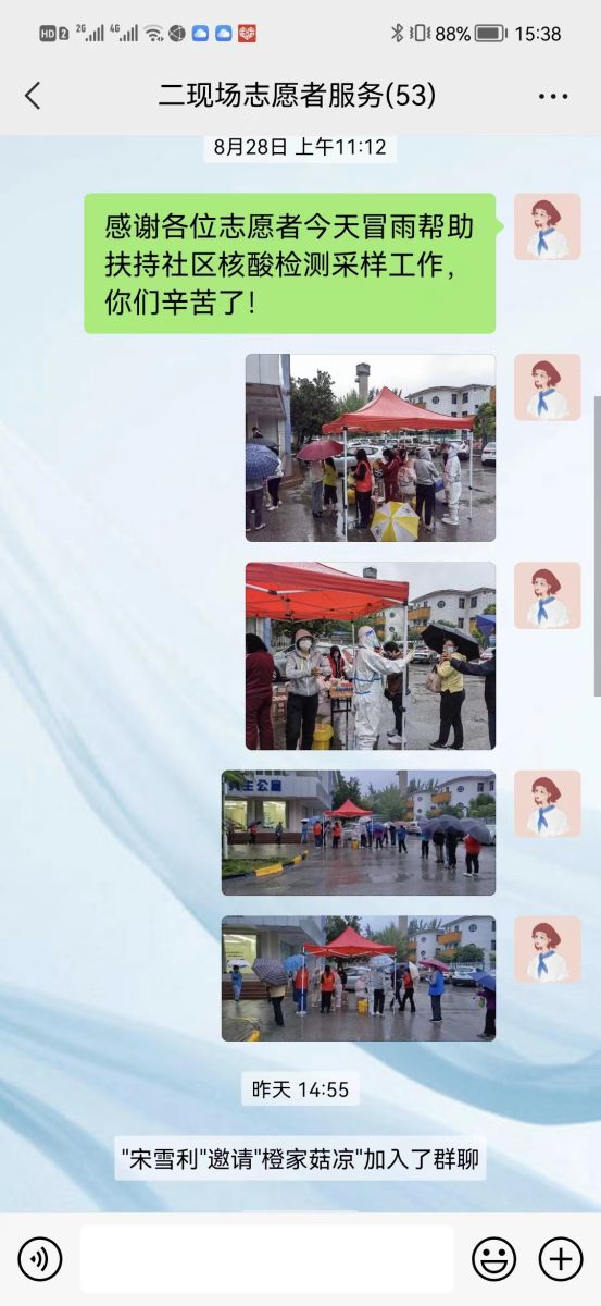 2022年8月,宝鸡突发疫情,社区按照上级安排在辖区进行了一次次、一轮轮全员核酸采样检测。接到通知后,辖区志愿者闻讯而动,积极报名,有居民志愿者、党员志愿者、大学生志愿者、中学生志愿者,文明单位包抓社区志愿者、市级单位干部下沉社区的志愿者,共计300余人。他们和她们,起早贪黑,有的做核酸采样,有的在扫码,有的在发帖,有的在维护秩序,有的耐心细致教居民打开自己电子码,默默无闻,努力工作,为保护家园,守护好居民的生命安全和健康做出了自己应有的贡献。