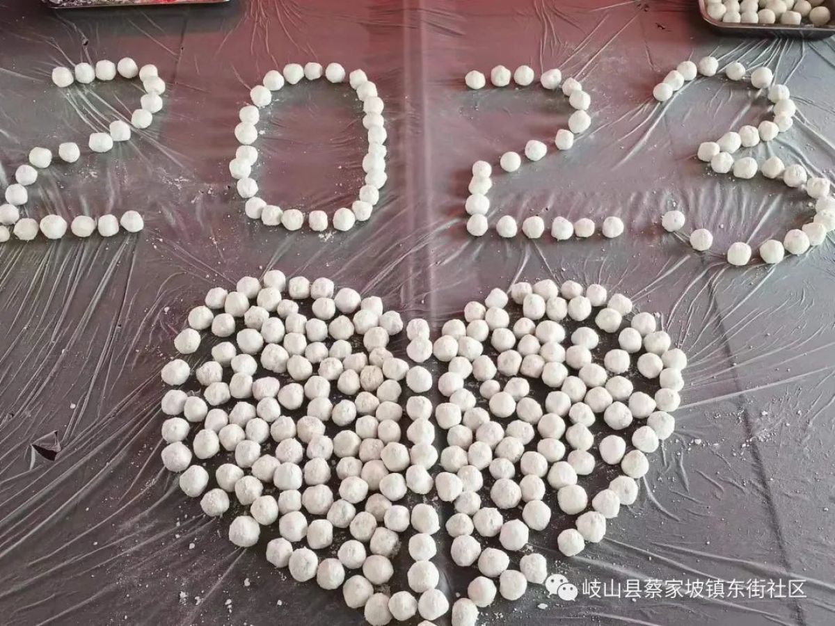 社区志愿者用提前准备好的糯米粉、白糖、黑芝麻、花生仁、核桃仁等材料精心制作传统美食-元宵。在大家的共同努力下,一块块白白的糯米面被团成一个球,象征着团圆平安的白色元宵摆满桌面,一派欢乐祥和的节日气氛。