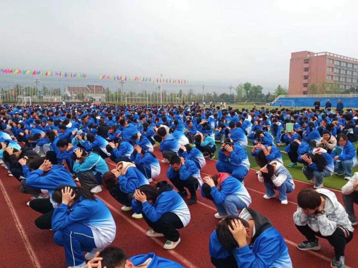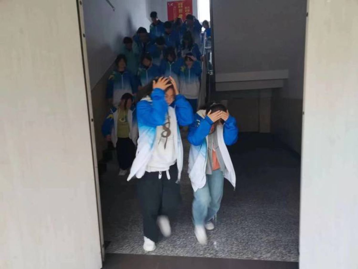 警报发出后,志愿者及老师第一时间达到指定位置,并指导学生双手抱头,蜷曲身体以降低身体重心,快速寻找有支撑力的地方进行紧急避险。