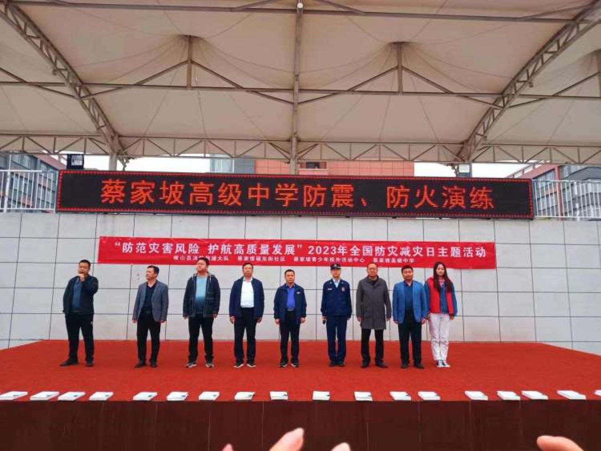为进一步增强辖区居民灾害防范意识, 提高辖区居民的防灾减灾和自救自护逃生能力,5月9日下午,蔡家坡镇东街社区新时代文明实践站联合结对共建单位蔡家坡青少年校外活动中心,“双报到”单位蔡家坡高级中学,驻区单位岐山县消防救援大队在蔡家坡高级中学开展了“防范风险灾害 护航高质量发展”为主题的防灾减灾演练及宣传活动。