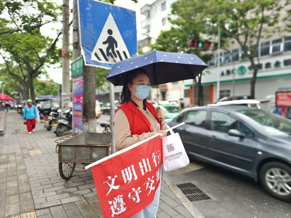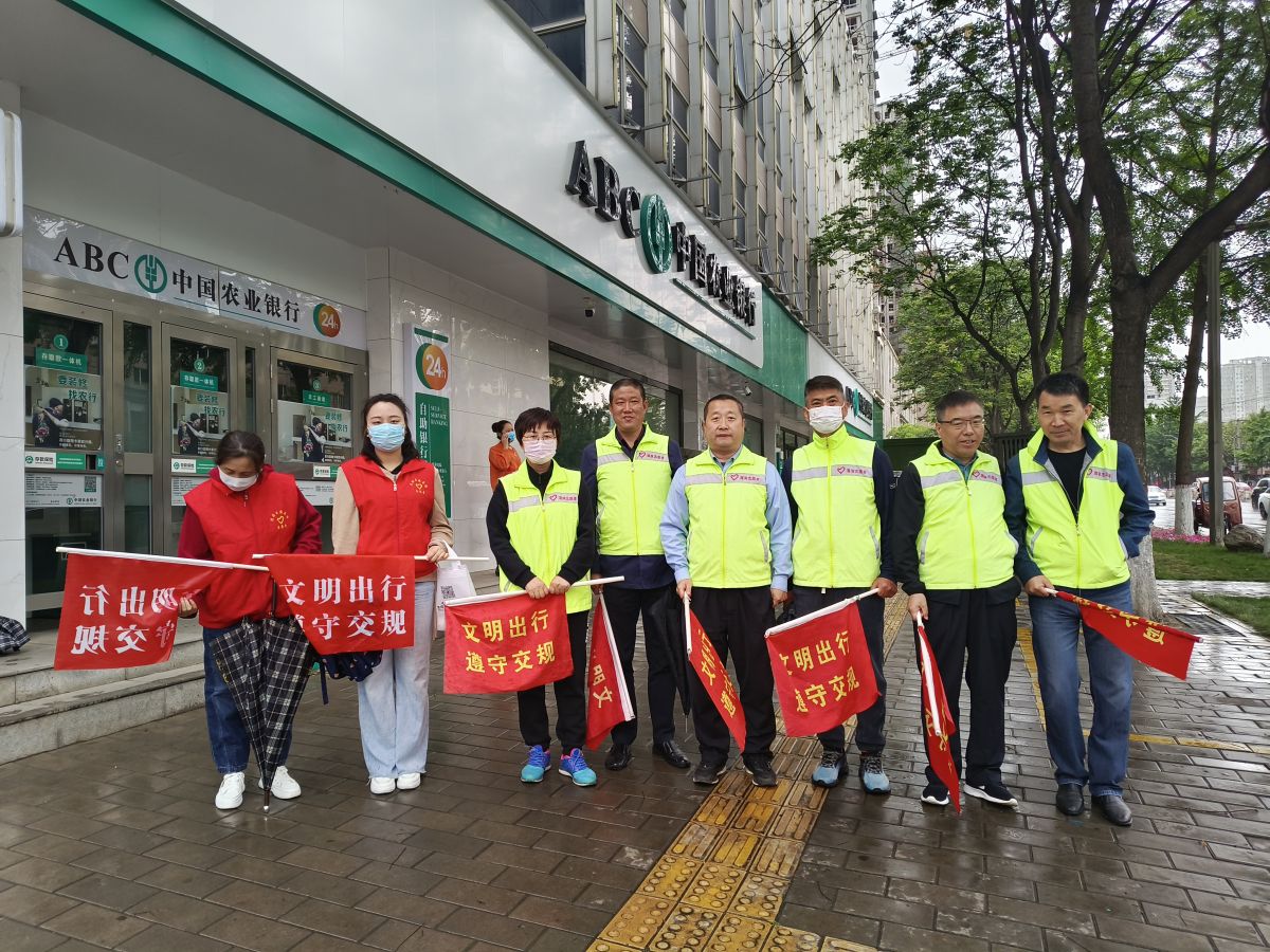 为了有效促进全国文明城市常态化管理工作,提高市民的文明交通意识,5月21日,公园路社区联合宝鸡市交通运输综合执法支队、渭滨区图书馆的8名志愿者化身为文明交通督导员,在峪泉路和公园路十字路口开展文明交通志愿服务活动。
