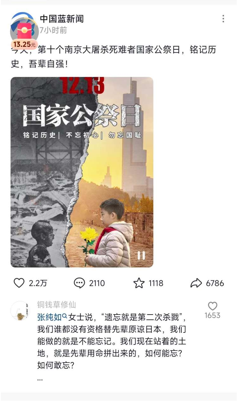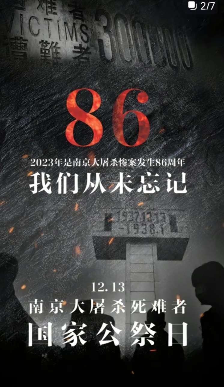 2023年是南京大屠杀惨案发生八十六周年,今年的12月13日是第十个国家公祭日。1937年的今天,侵华日军攻陷南京,30多万中国居民惨遭杀戮,山河破碎,风雨飘摇,曾经的血与泪。作为后人,我们不能忘,也不敢忘,今天我们以国之名悼念同胞,铭记历史。