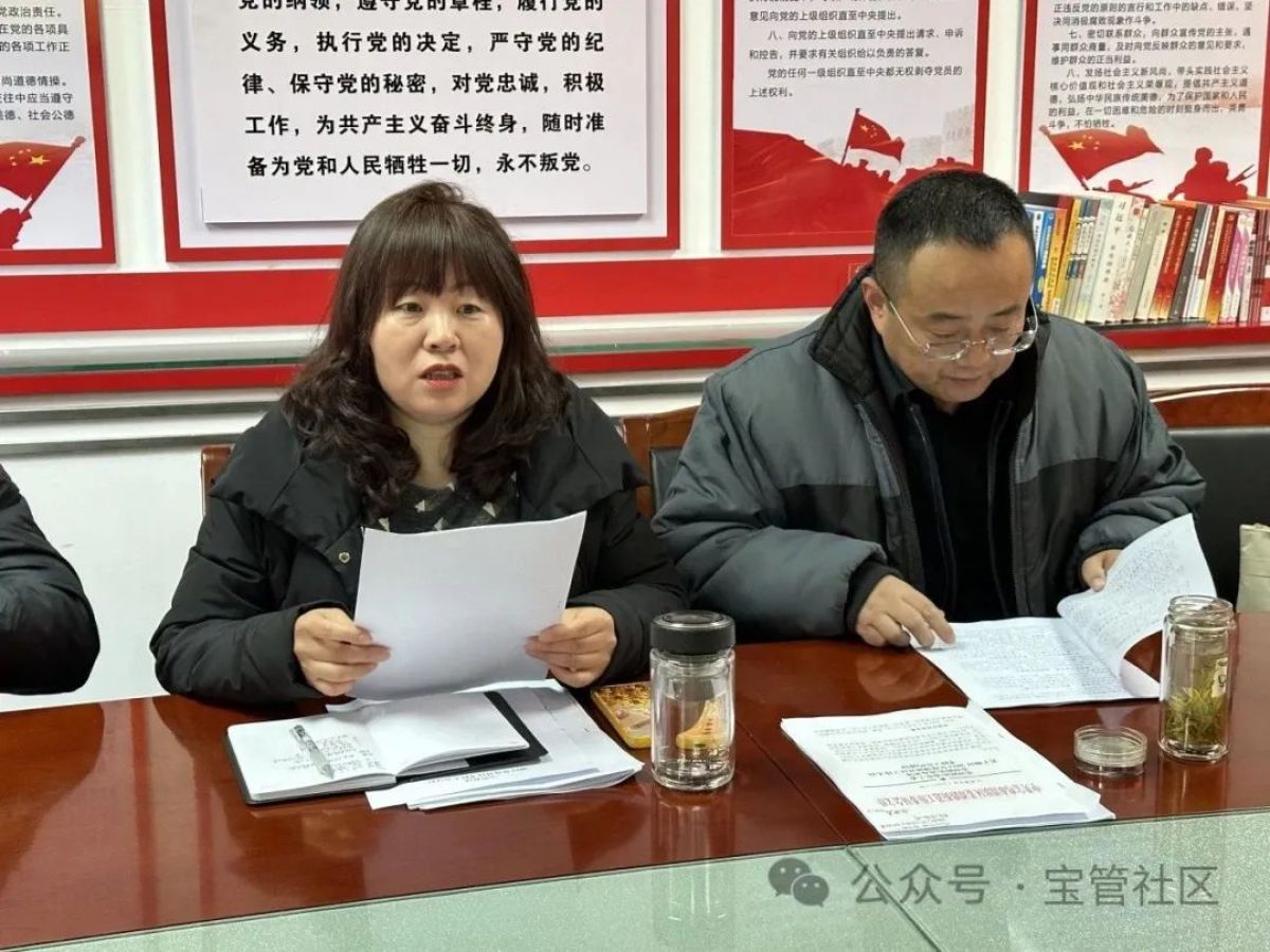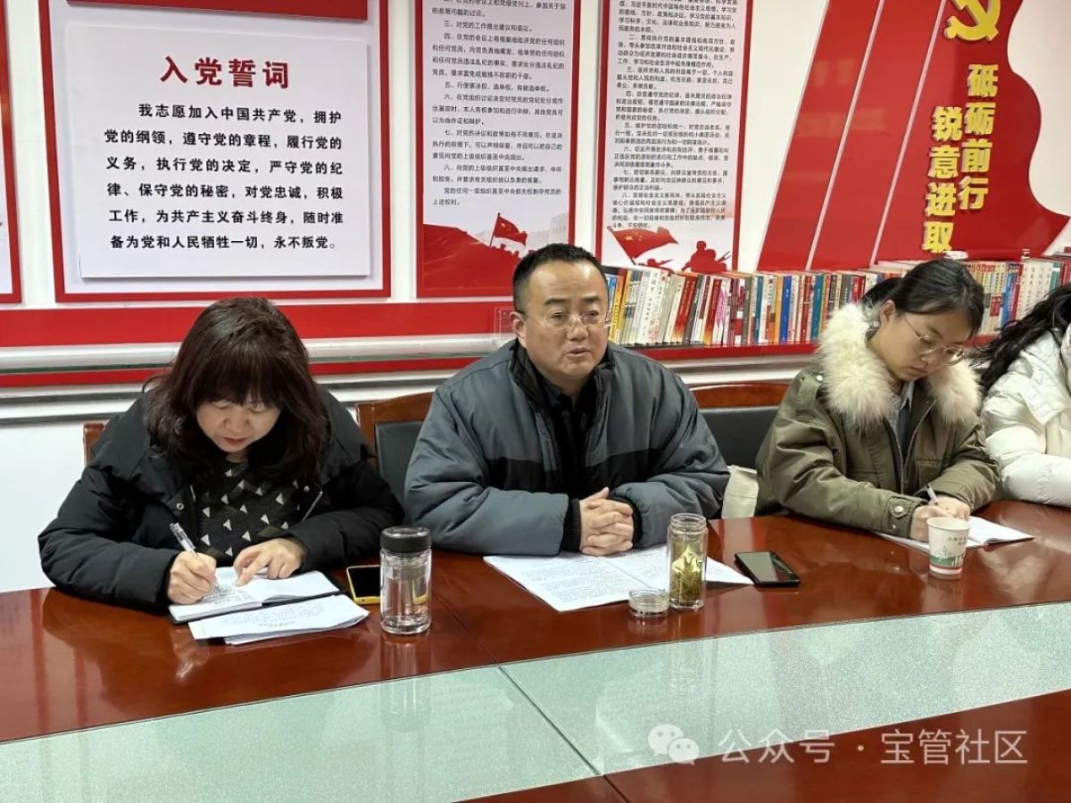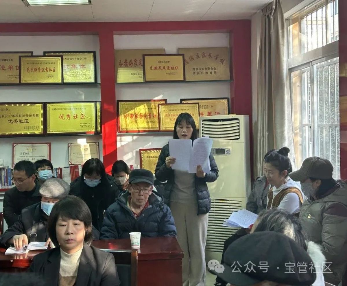 宝管社区党委书记、居委会主任张晓春代表班子从党建工作、民政服务、为民服务项目、社区特色亮点等方面,对社区一年来工作进行全面汇报,反思总结工作中存在的问题并提出整改目标,在2024年度充分发挥领头雁作用,带领社区全体工作人员砥砺前行,努力践行为民服务使命。