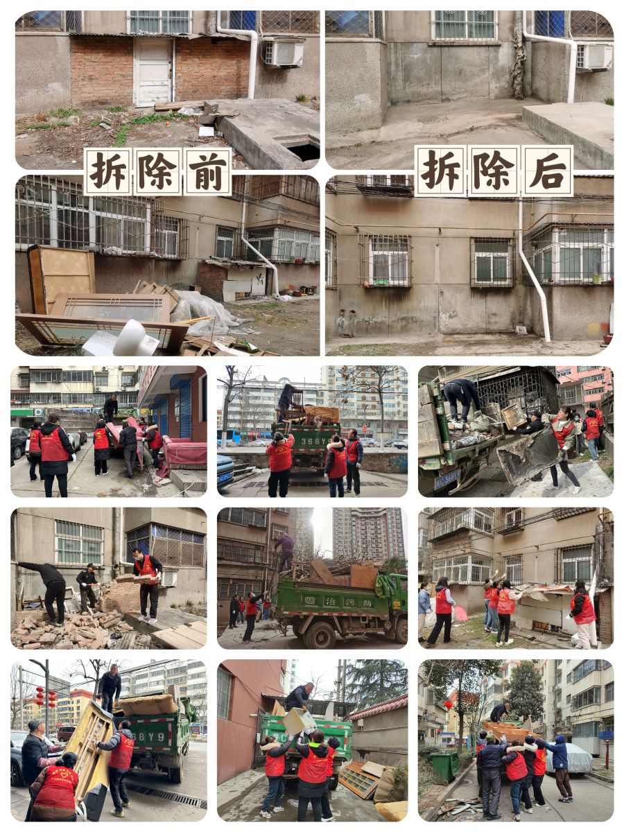 拆除违建,搭建邻里“和谐网”。社区网格员下沉小区,收集群众意见,系统、全面摸排辖区公共区域乱堆乱建情况并形成问题清单,针对物业管理小区,网格员坚持常态化检查督导,实地跟进物业落实乱堆乱建、卫生死角整改责任。对于自主管理及物业管理薄弱的小区,通过入户走访沟通,告知乱堆乱建对其他居民安全和生活所产生的影响,宣传违建整治工作的重要性和必要性,做好群众思想工作同时提高群众文明意识,并由社区统一组织,协助清理乱堆乱放、拆除私搭乱建,清运垃圾杂物,还小区居民一个安全清爽的生活环境。