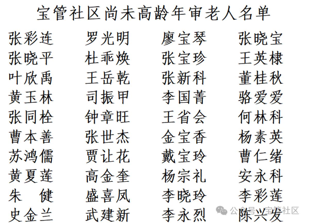 请以下尚未进行高龄年审的居民及时进行年审,请勿错过年审时间,如遇到问题请及时联系社区,联系电话:0917-3626288。