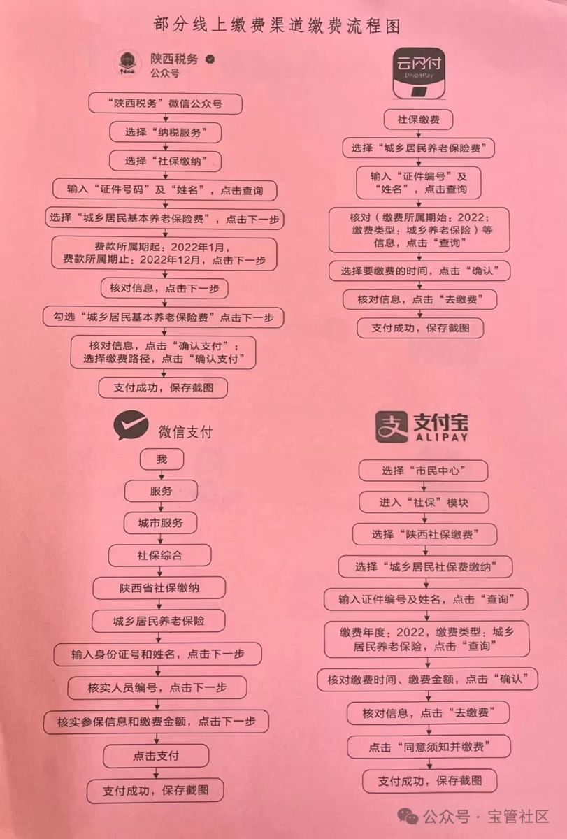 现已开通“陕西社会保险APP”、微信小程序“社保云缴费”2024年度城乡居民社会养老保险缴费渠道。