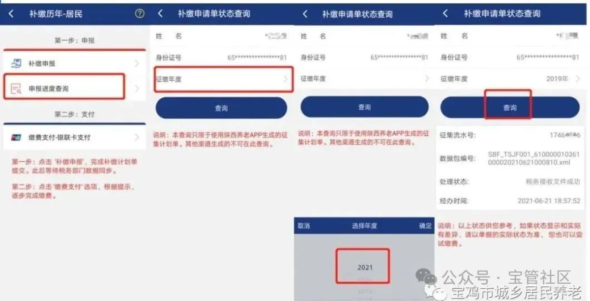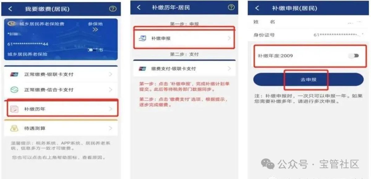 对于补缴人员,需要首先在陕西养老保险App内完成补缴申报(每次申报只能选择一个年度,如果欠缴年份较多,需要针对每个年份分别进行申报操作),等待税务部门成功接收申报信息后进行缴费。