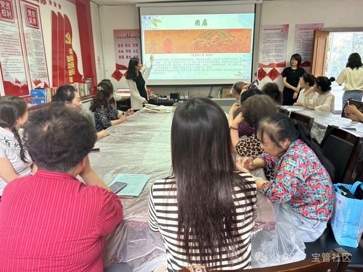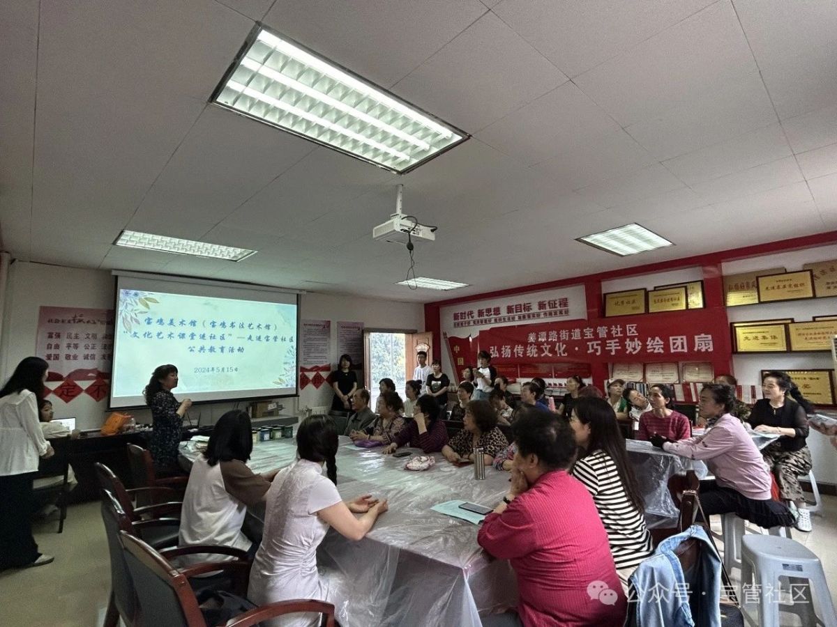2024年5月15日上午,姜谭路街道宝管社区联合党建联点单位宝鸡市文旅局,特邀宝鸡市美术馆的专业讲师在社区开展“弘扬传统文化·巧手妙绘团扇”主题活动,带领居民共同了解团扇的悠远历史文化及深厚的文化底蕴。
