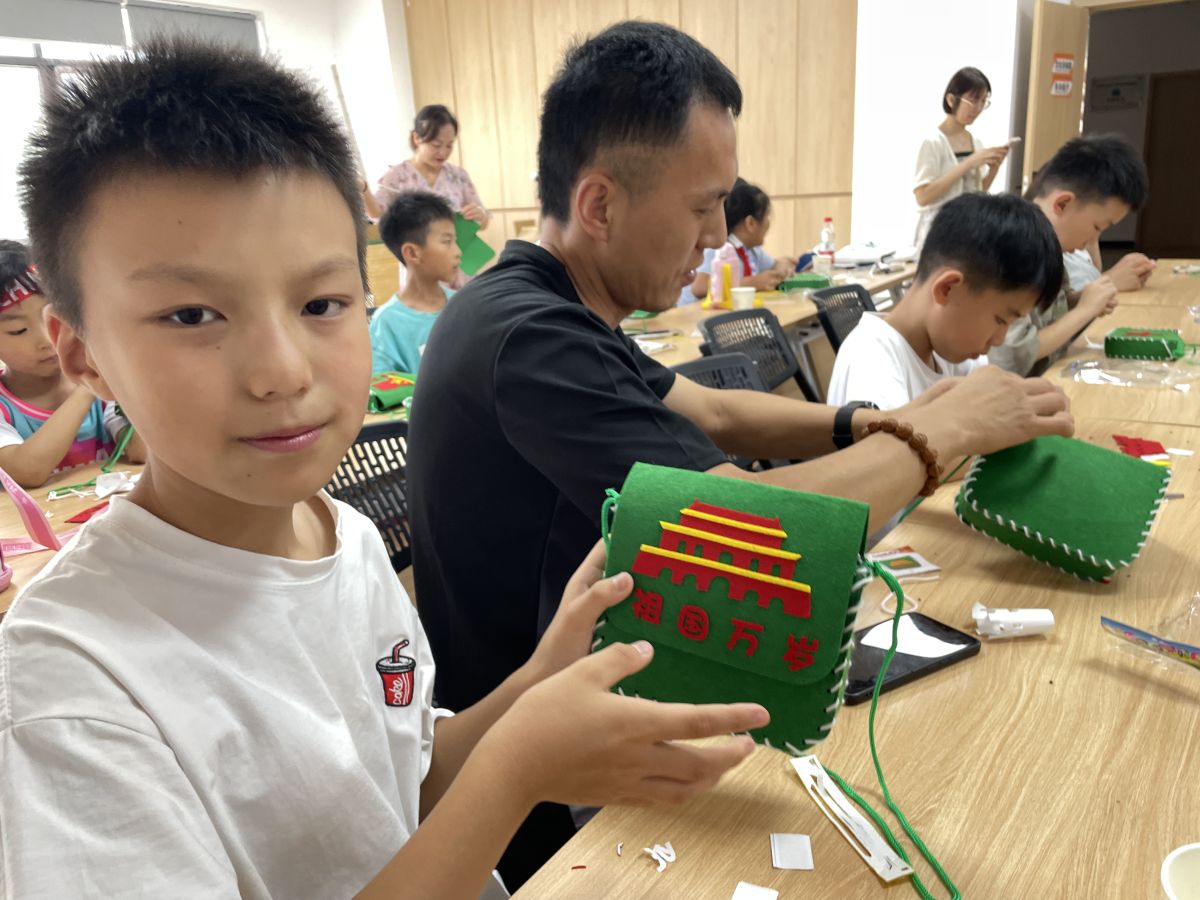 接下来,学生和家长们一起,制作爱国主题斜挎包, 同学们一起动手制作,穿针、缝线、粘贴......不一会,一个个印有“祖国万岁、热爱祖国、厉害了我的国”等文字的爱国主题斜挎包展现在大家面前。