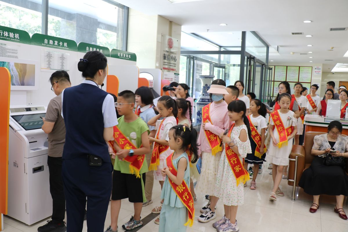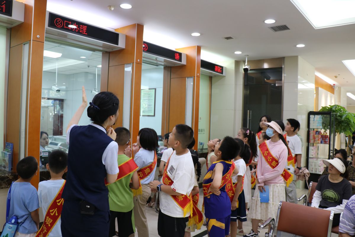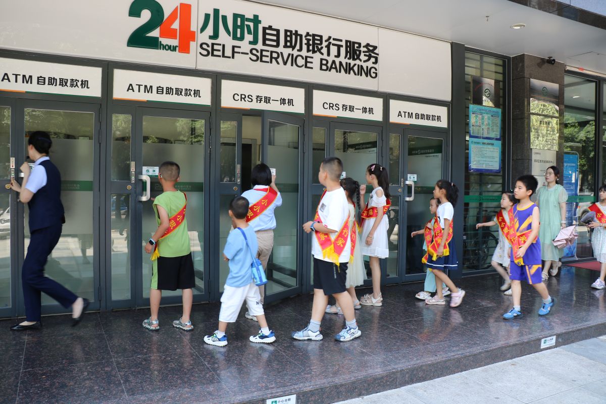 随后,银行工作人员带领孩子们参观了银行服务大厅,详细讲解了银行内的业务区域和每一个电子机具的作用。信贷业务区、现金柜台、对公业务区……ATM机、取号机、网银体验机……同时邀请孩子们体验从取号到营业窗口的办理流程,让他们对银行岗位有了真实感受。