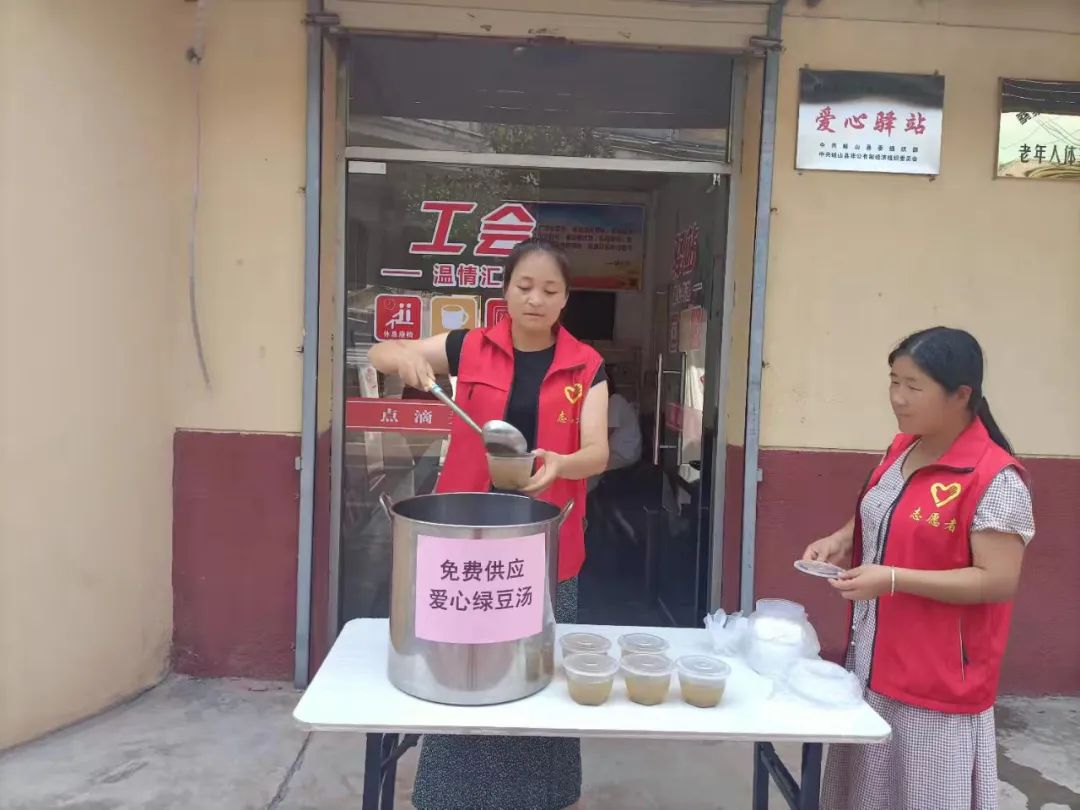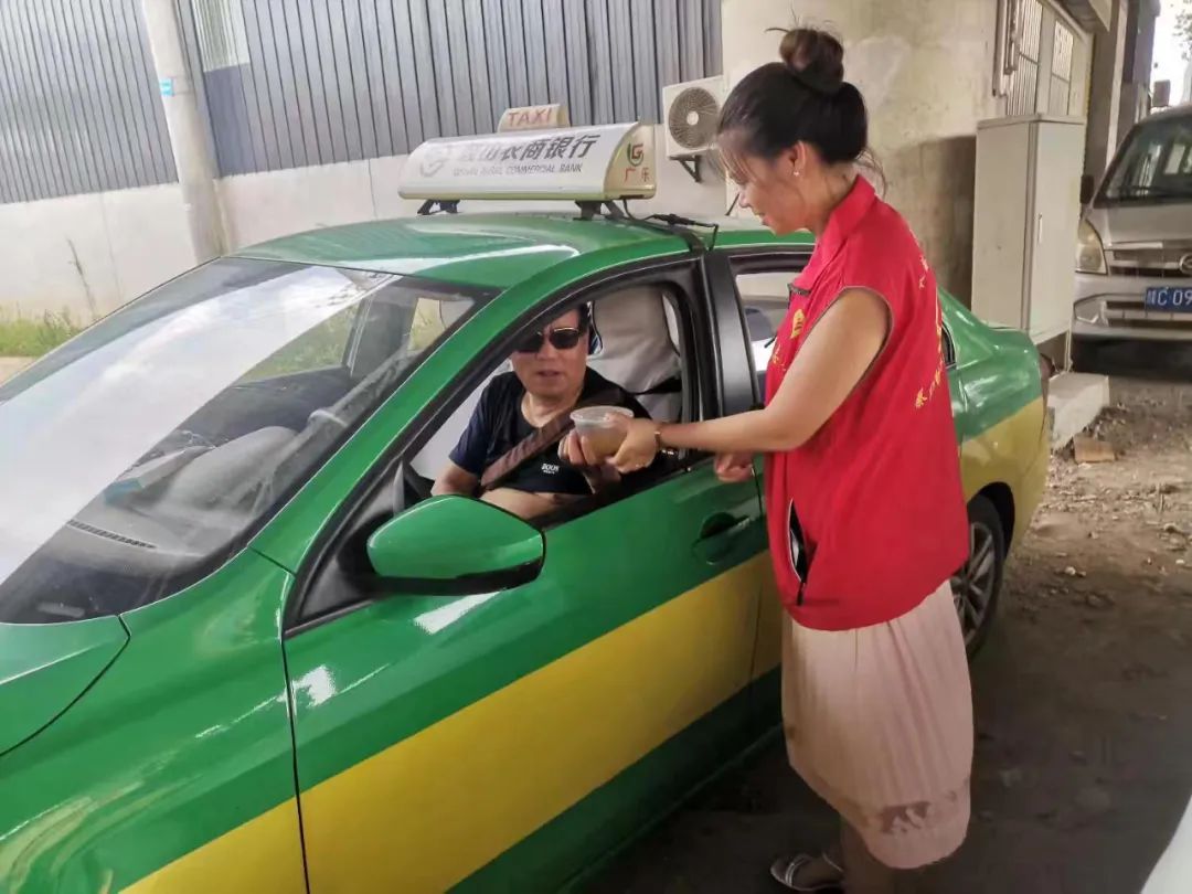 一张张挂满汗水的脸庞,一件件被汗水浸透的工装,他们的每一个身影都让人肃然起敬。志愿者带着满满的爱心把绿豆汤送到户外工作者手上,以实际行动传递着丝丝清凉。同时也叮嘱他们做好防暑降温措施、注意休息、保持身体健康。大家喝着绿豆汤,笑在脸上,甜在心里,一碗碗爱心绿豆汤彰显着一颗颗为群众服务的初心,暖心的服务也收到了群众的点赞。