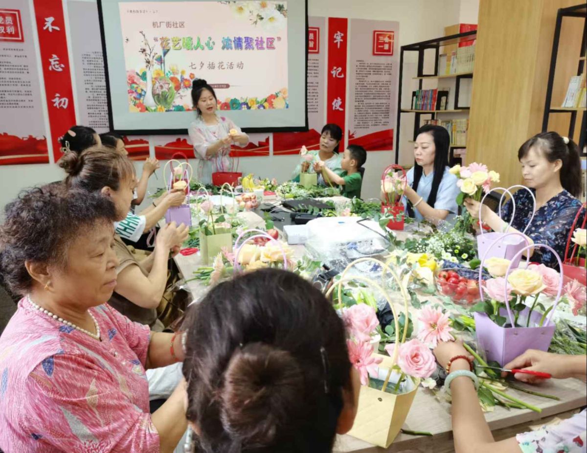 为弘扬传统节日文化,营造温馨浪漫的七夕节日氛围。8月9日,机厂街社区组织辖区居民开展了“花艺暖人心 浓情聚社区”七夕主题活动。