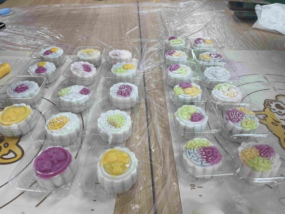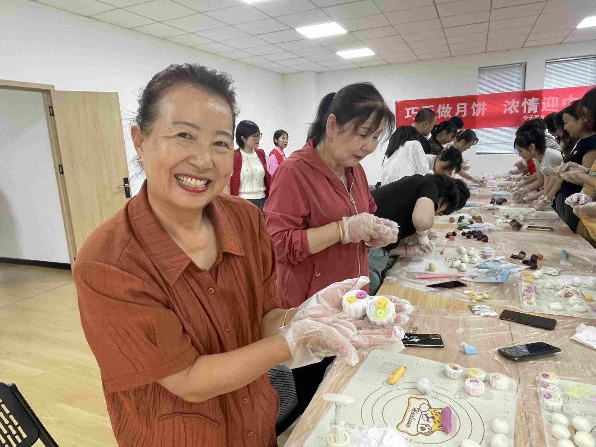 现场两人一组、分工合作,和面、压皮、包馅,最后放入模具中定型,每个步骤都有条不紊地进行着,一个个精致的月饼呈现在眼前。活动现场充满欢声笑语,大家纷纷拿着心爱的作品互相展示、拍照留念,气氛热烈而愉悦。