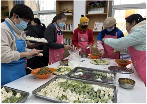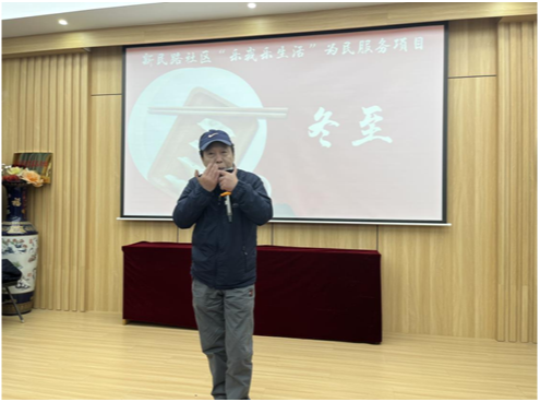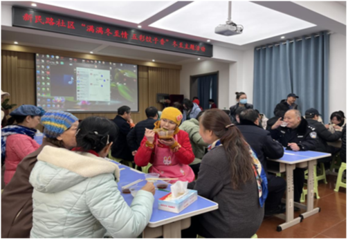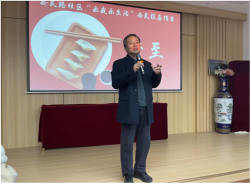 活动中,社区党员群众和志愿者们齐聚一堂,大家一边聊着家常,一边快乐地包着饺子,其乐融融。人多力量大,只见她们轻轻一攥,一排排胖胖的饺子很快便包好了,一个个皮薄馅大的饺子摆满了桌子,当大家聚精会神地包着饺子时,社区社会组织和志愿者登上舞台为大家带来精彩表演,张德元老师从“冬至节气到节日的演化过程”切入,引出“大如年”的冬至在二十四节气中的特殊地位,生动形象地讲解冬至的由来和习俗。新火之声的朗诵充满力量,刘敬锁老师演唱的歌曲《母亲母亲》深情感人,张宝文老师的口琴时而豪迈奔放,时而温柔悠扬,展现了新时代人民的豪迈气概,诉说着邻里间的深情厚谊。居民们一边观赏,一边互动交流,分享了包饺子的技巧,场面温馨而祥和,在这个过程中,语言、文化和饮食的交融得到了生动的展现。