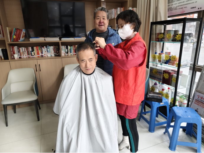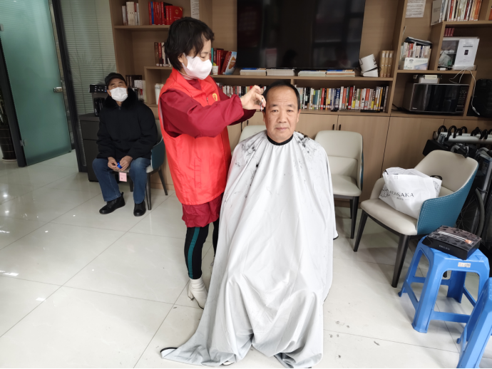 上午九点,爱心义剪理发师准时抵达社区服务中心,她提前准备好理发工具,将场地布置成简易的“美发工作室”。