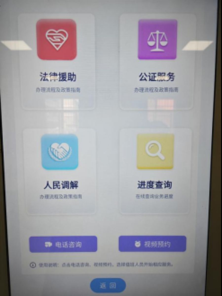 公共法律服务自助机借助人工智能、大数据、互联网等技术,整合“12348”法网所有面向公众的法律服务,以线上、线下相结合的形式,全方位为群众提供法治宣传、人民调解、法律援助、公证服务、律师咨询、司法鉴定等智能导引和自助查询业务。