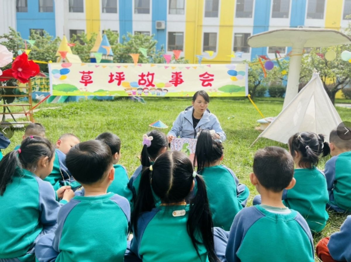 活动在充满童趣的“草坪故事会”中拉开帷幕,春日的自然场景与绘本故事巧妙融合,孩子们围坐在柔软的草坪上,沐浴着暖阳,聆听着精彩的故事。老师手持《穿靴子的猫》绘本,用生动的语言、丰富的肢体动作,将故事里奇妙的场景生动地展现在孩子们眼前。“小朋友们看,这只猫遇到困难没有害怕,而是冷静思考办法!”老师适时引导,“如果是你们,会像它一样勇敢面对挑战吗?”随着老师绘声绘色的讲述,孩子们仿佛跟着穿靴子的猫潜入城堡,在跌宕起伏的情节中,潜移默化地理解了遇到困难要积极思考、勇敢行动的道理。