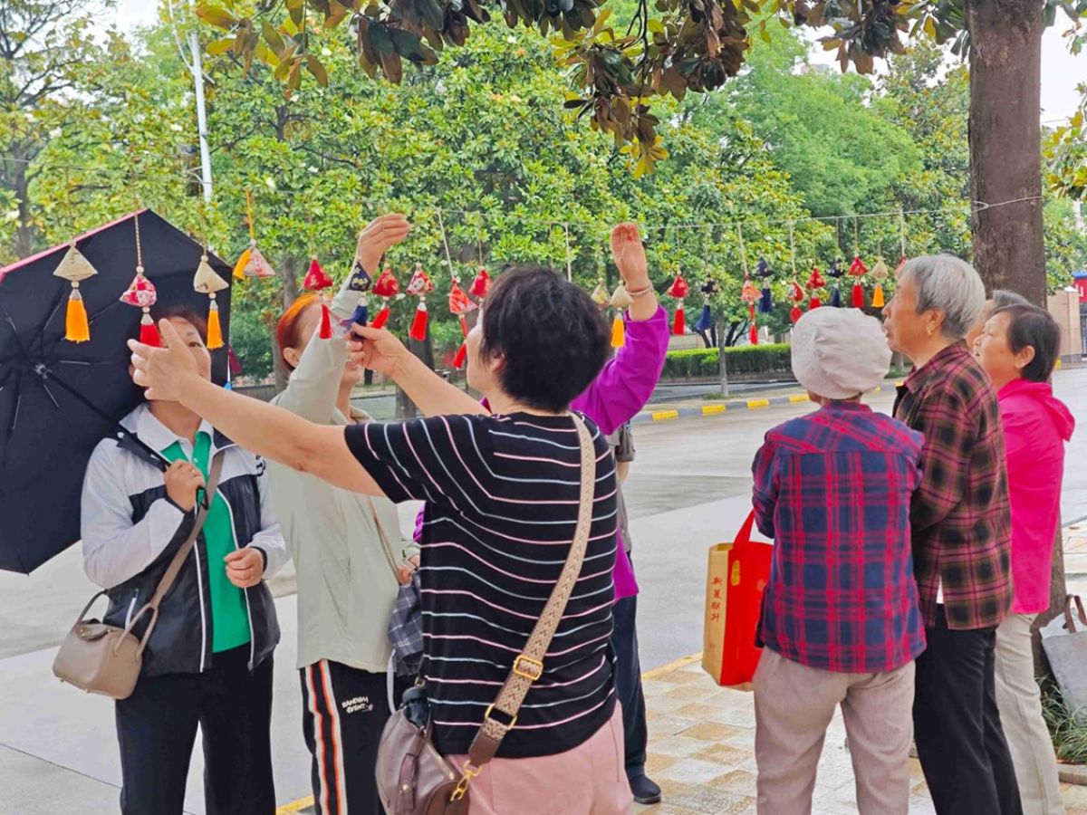 工作人员提前准备了装有艾草、菖蒲等传统香料的精美香囊,亲手将象征驱邪避疫、祈福安康的香囊有序悬挂在现场进行展示,形成一道独特的风景。活动结束后,这些满载祝福的香囊作为礼物现场发放给居民,传递美好祝愿。
