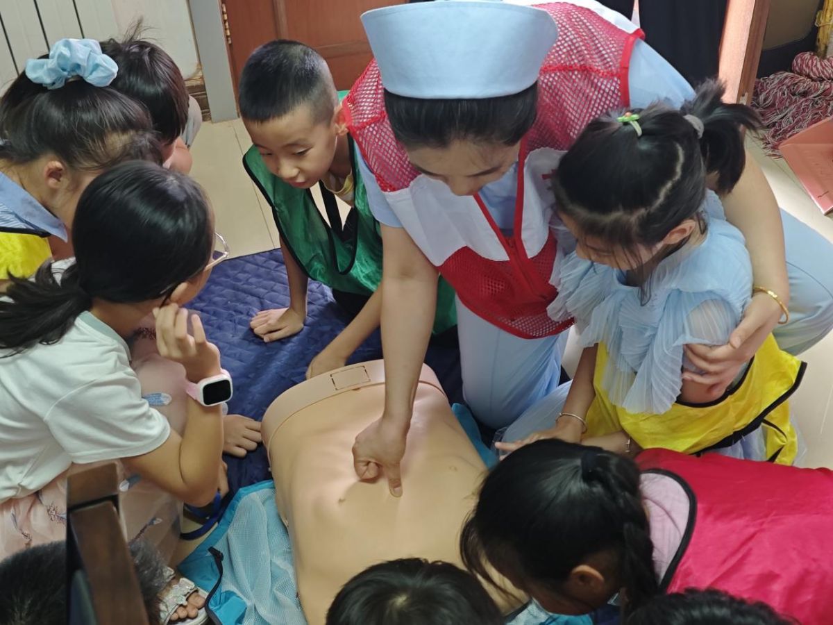 社区卫生服务中心医护人员现场演示了心肺复苏等急救技能。溺水后4-6分钟是黄金抢救时间,医护人员强调,“掌握正确的急救方法能大大提高生还几率。”在专业人员指导下,孩子们轮流进行模拟练习,学习如何正确进行急救。