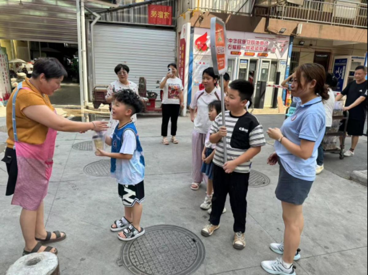 活动当天,在老师和社区工作人员的指导下,孩子们化身“小小暖心使者”,认真清洗柠檬、切片、冲泡、加冰,一步步制作出清爽可口的柠檬水。随后,孩子们带着这份特殊的“夏日礼物”,在老师和工作人员的带领下走进商业街区。“阿姨,您辛苦了,这是我们做的柠檬水,喝一杯凉快一下吧!”在一家早餐店前,店主李女士接过孩子递来的饮品,脸上露出了惊喜的笑容:“这杯柠檬水太及时了,忙活一上午正渴呢,孩子们太贴心了!”接过饮品的商户们脸上洋溢着惊喜与感激,纷纷向孩子们道谢,简单的互动,传递着双向的温暖。