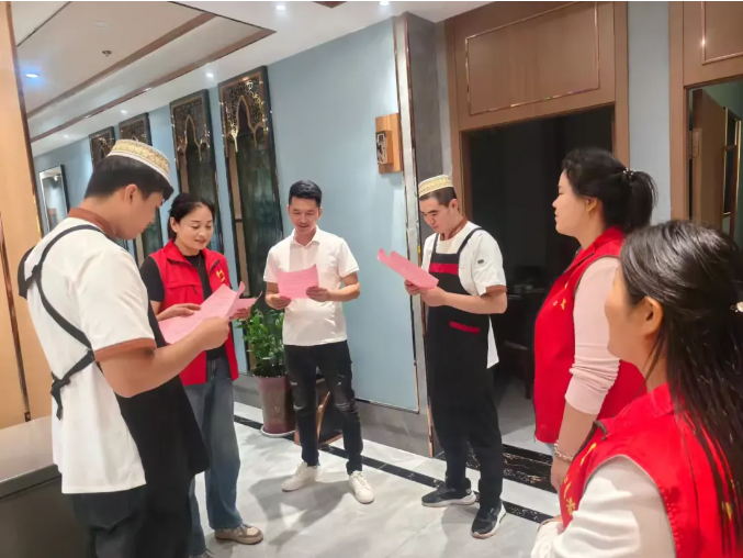 随后,社区志愿者走进小区、沿街商铺、少数民族经营的餐馆等,发放宣传资料,普及党的民族政策、民族法律法规以及民族团结进步基本知识。同时,引导大家牢固树立正确的国家观、民族观、宗教观和文化观,自觉做民族团结的维护者、促进者和实践者。