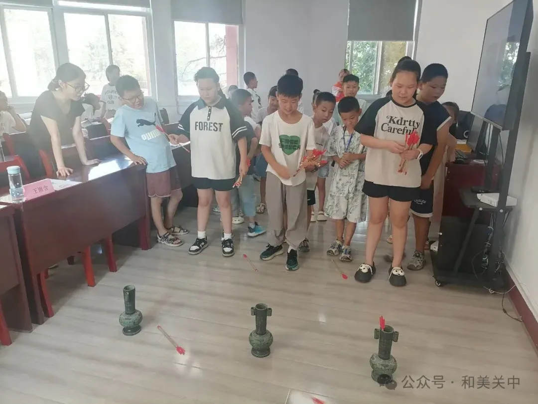凤翔区博物馆的工作人员向孩子们展示了丰富的文物图片资料,详细讲解了这些文物的来历、价值以及背后的历史故事,随后的“文物集印”环节成了孩子们的最爱。最热闹的当属投壶游戏,孩子们站在指定线外,手持箭矢尝试投入仿古铜壶,“中啦!”的欢呼声此起彼伏。老师笑着说:“投壶是古人的‘礼仪游戏’,既要瞄准,又要懂规则,就像我们做事既要努力,也要守规矩。”