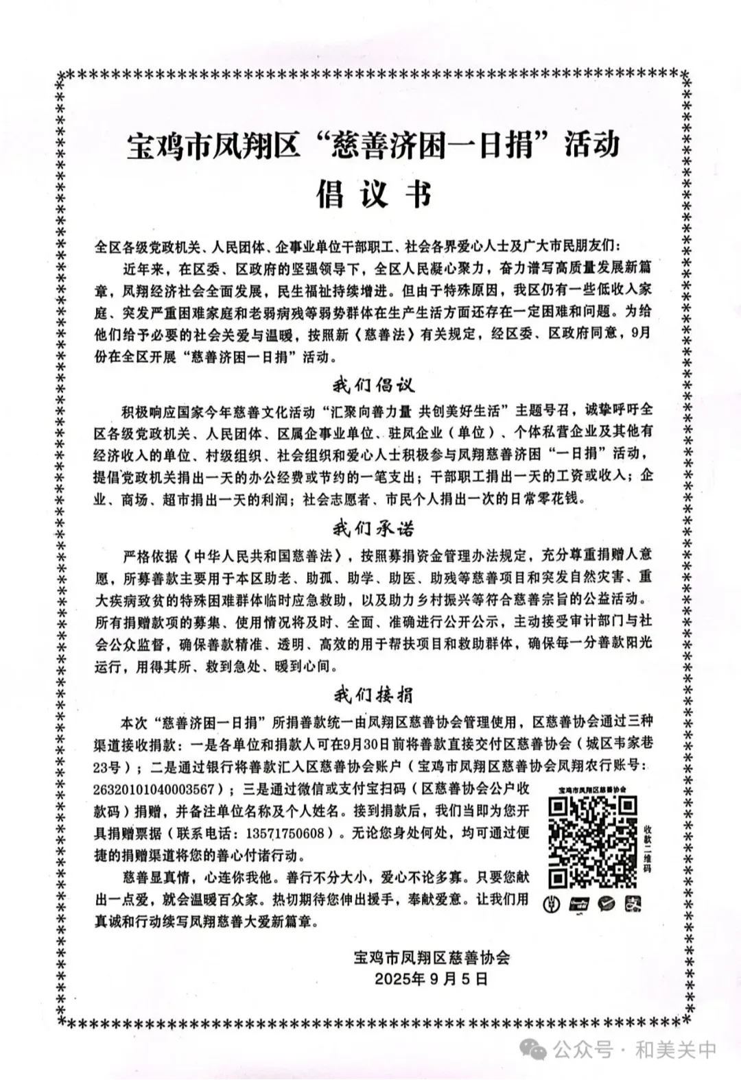 【慈善】宝鸡市凤翔区“慈善济困一日捐”活动倡议书