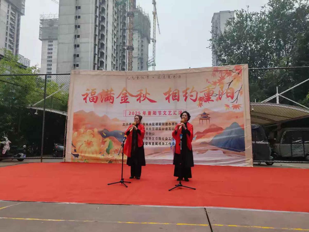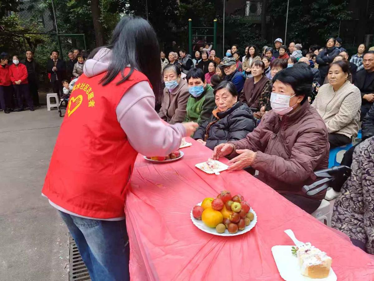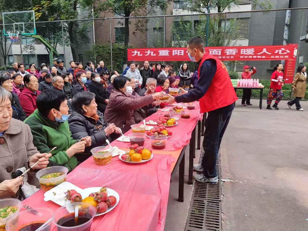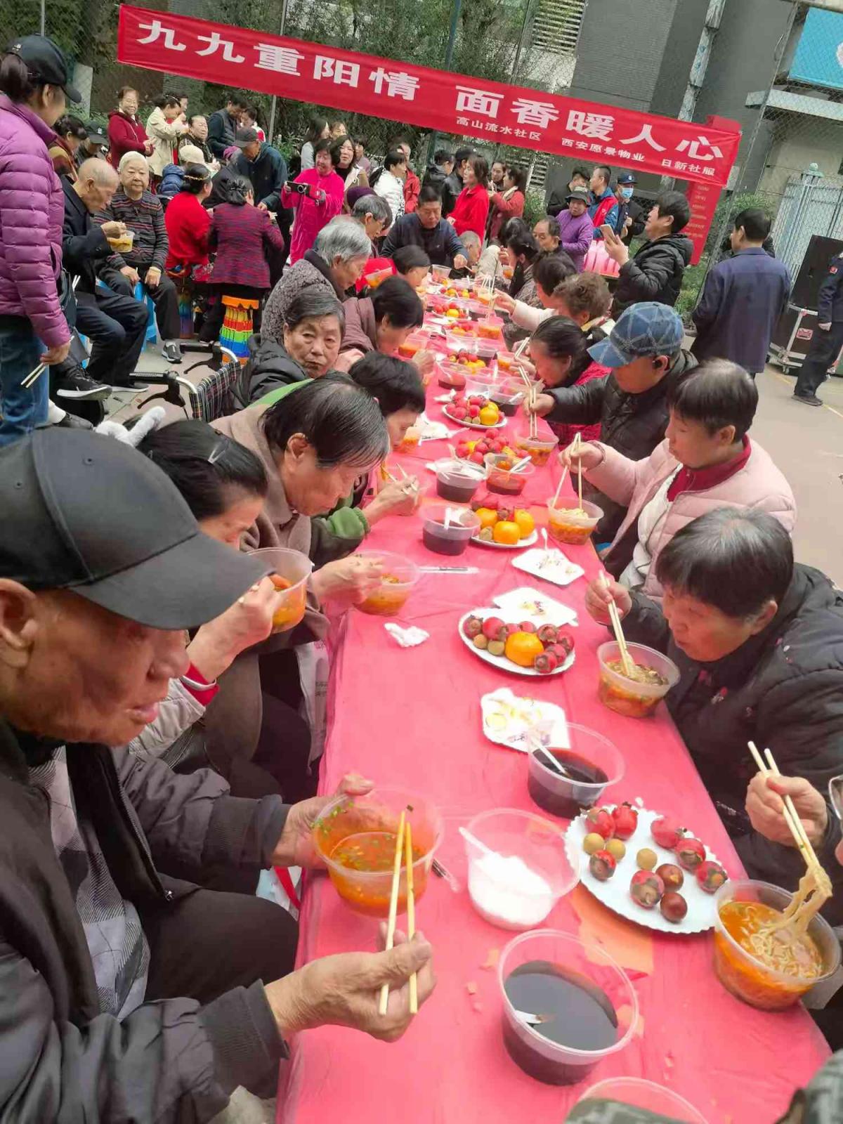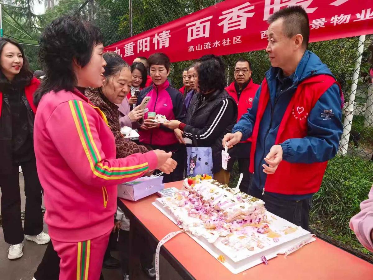 活动伊始,社区毕新平书记为现场居民送上了真挚的重阳祝福,言语间满是对居民的关怀与温暖。她首先祝大家重阳安康、幸福绵长,用接地气的话语问候着大家,并表示社区就是大伙儿共同的家,今天就是要大家吃好、喝好、看好、玩好!社区为大家准备了一碗长寿面、一台暖心戏、一份生日情。长寿臊子面,寓意着健康长寿,希望在座的每一位长辈,吃了这碗热腾腾的臊子面,身子骨都硬硬朗朗,日子都过得有滋有味;文艺汇演是社区文体队和热心居民自发排练的节目希望大家喜欢,咱们住在高山流水社区,图的就是一个开心乐呵;还特别邀请了几位80岁以上高龄老人,大家一起过个集体生日,一起切大蛋糕,同时也把这福气传递给在场的每一个人!