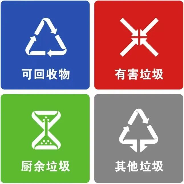 目前中国生活垃圾一般可分为四大类:可回收物、厨余垃圾、有害垃圾和其他垃圾。