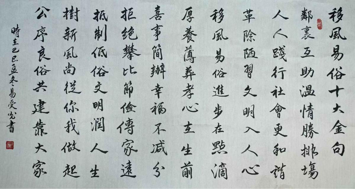 诗韵余音未绝,翰墨清香已至,书画创作展同样引人注目。社区银龄志愿服务队(“翰墨传薪”综合服务小队)展出了40多幅移风易俗主题原创作品。这支队伍默默耕耘于文化传承与社区服务一线。在现场,书画代表详细讲解创作理念和背后的深意,让观众在艺术熏陶中深化对文明新风的理解。这些精心创作的书画作品,或泼墨挥毫,书写倡导文明新风的格言警句;或精心勾勒,描绘和谐美好的社区生活图景。一笔一划,一景一物,无不凝聚着老人们对于摒弃陈规陋习、树立文明新风的深切认同与美好期盼,让观展居民在艺术欣赏的潜移默化中接受了新风尚的洗礼。