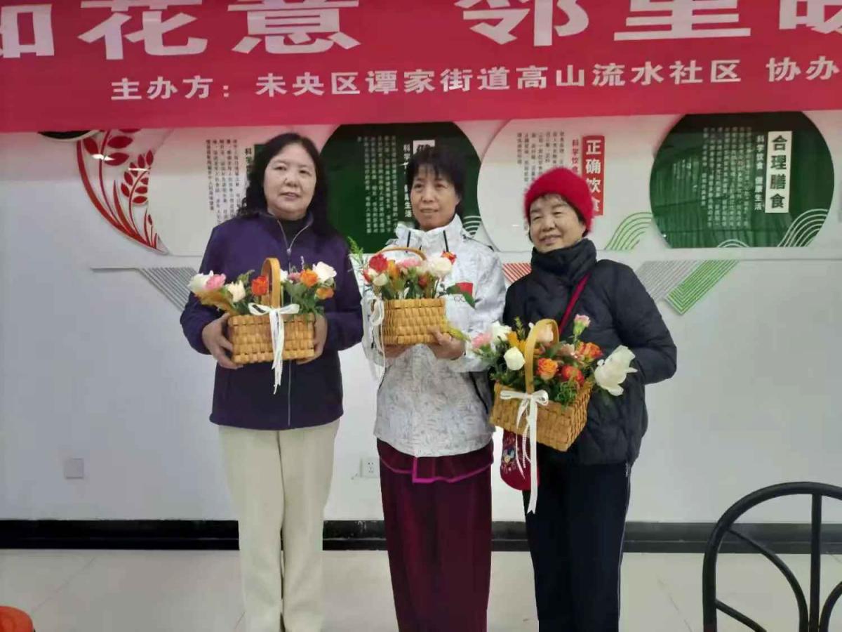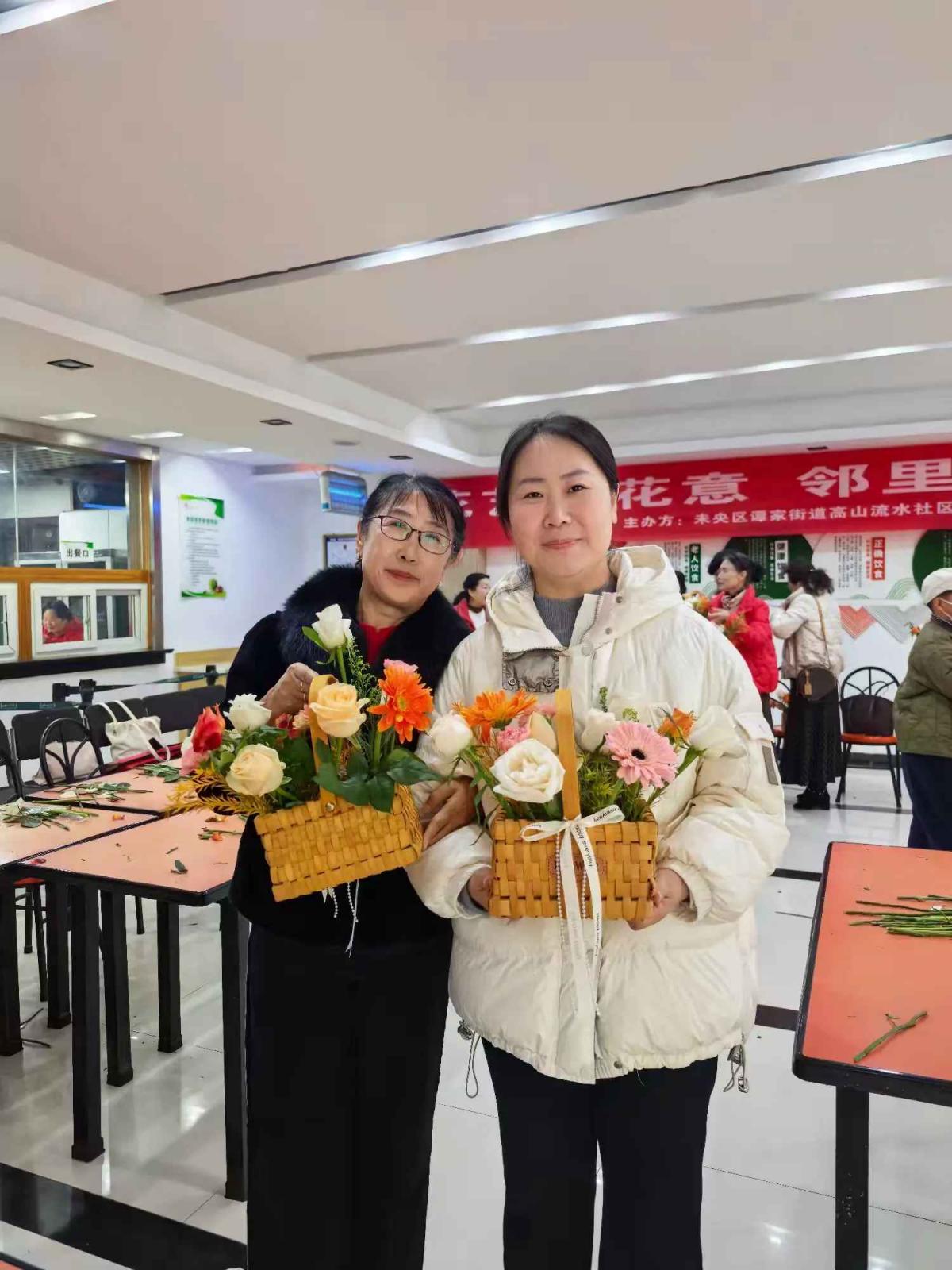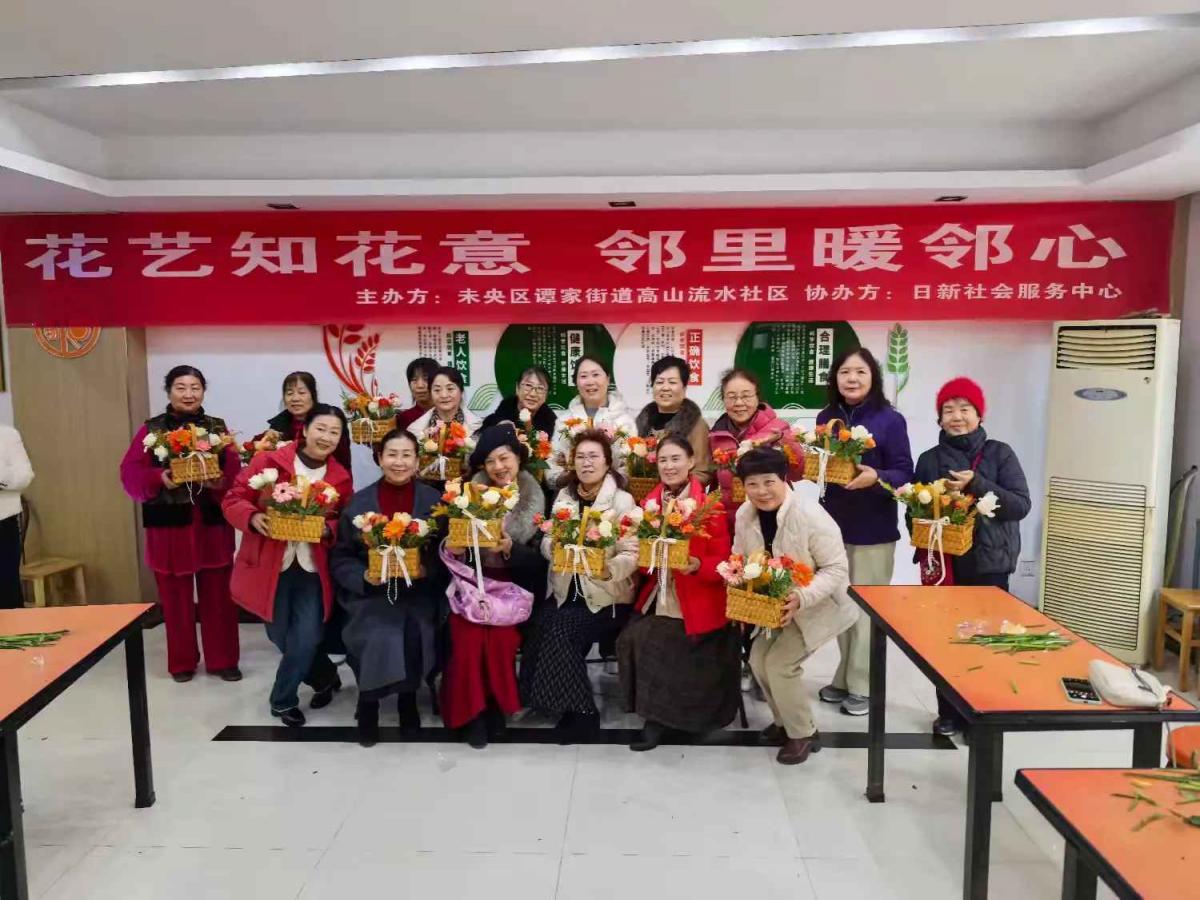 活动尾声,大家手捧自己的作品合影留念,脸上洋溢着满足与自豪。一篮篮鲜花不仅装点了生活,更联结了邻里情感。此次活动为居民们提供了放松身心的机会,也搭建了交流互动的平台,生动展现了高山流水社区和谐美好的生活氛围。