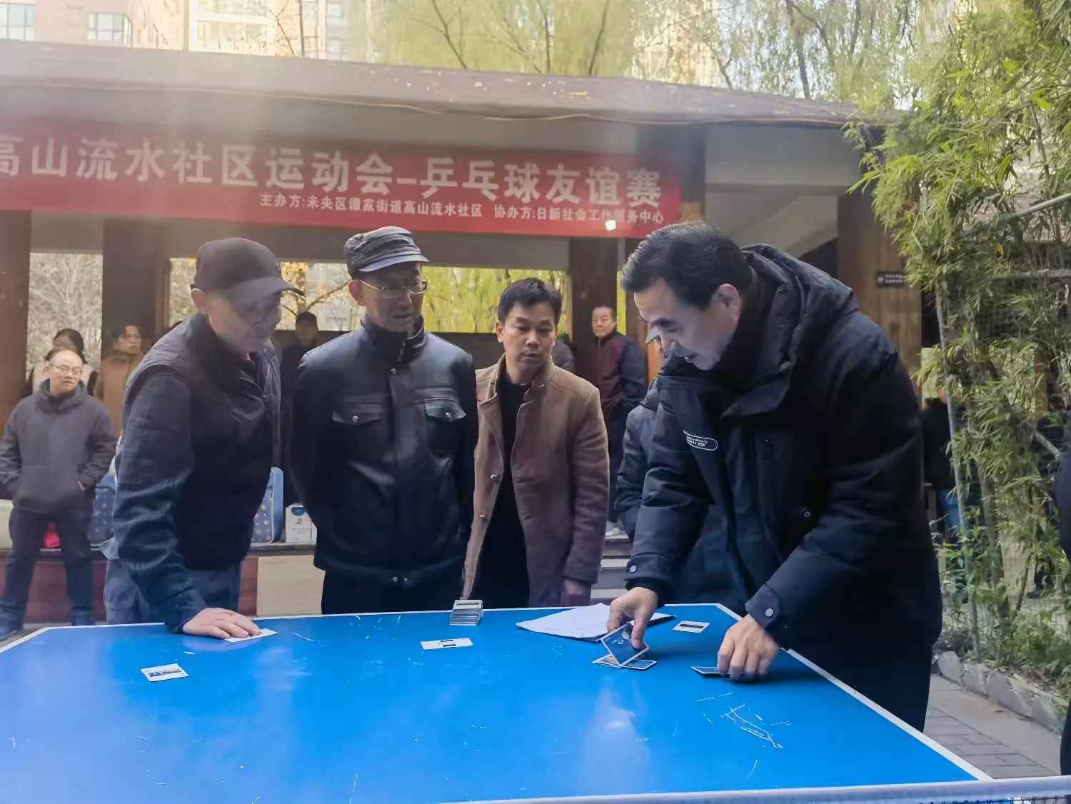 比赛前几周,社区党员们就忙活开了。党员们详细筹划比赛,商讨规则,并按性别分组;党员贾金福、郭旭、辛志峰带领年轻党员布置场地,搬桌椅、擦球台并校准球网高度,规划观众与休息区以维持秩序。