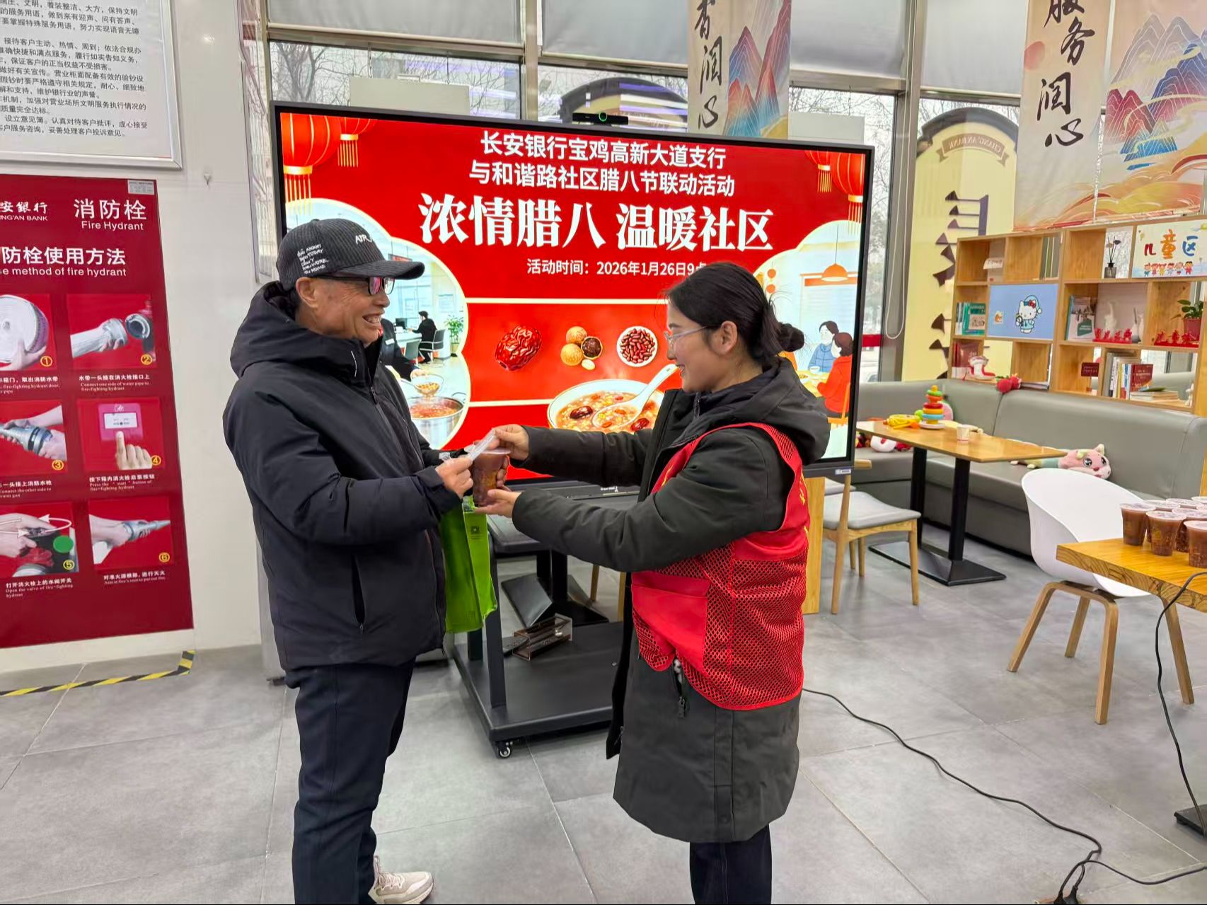 与此同时,一场“上门送暖”行动同步开展。社区马书记与长安银行王行长带领工作人员,提着精心熬制的腊八粥与慰问礼品,逐一走访辖区独居老人、低保户、困难家庭、残疾人等特殊群体。每到一户,大家都与居民促膝长谈,细心询问身体状况、生活需求与实际困难,耐心倾听诉求,叮嘱他们注意冬季保暖与用火安全,送上腊八节的美好祝愿。“感谢社区和银行一直惦记着我们,这碗粥喝着心里真暖!”独居的何大姐紧紧握着工作人员的手,眼中满是感动。一句句关切的问候、一份份贴心的礼物,让特殊群体在寒冬中感受到社区大家庭的温暖,让年味在关爱中愈发浓厚。