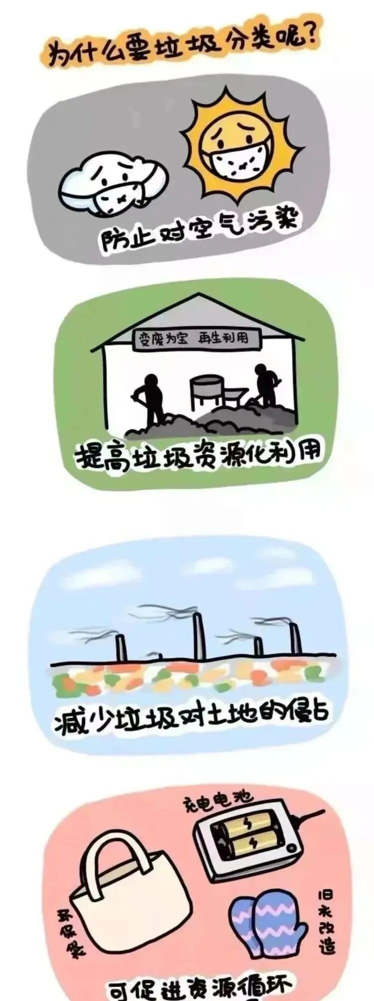 垃圾是放错了地方的财富。回收垃圾不但美化环境,而且垃圾再利用可以节省新资源的开采,从而从根本上减少垃圾。垃圾分类收集可以更快实行废品回收和资源循环利用。