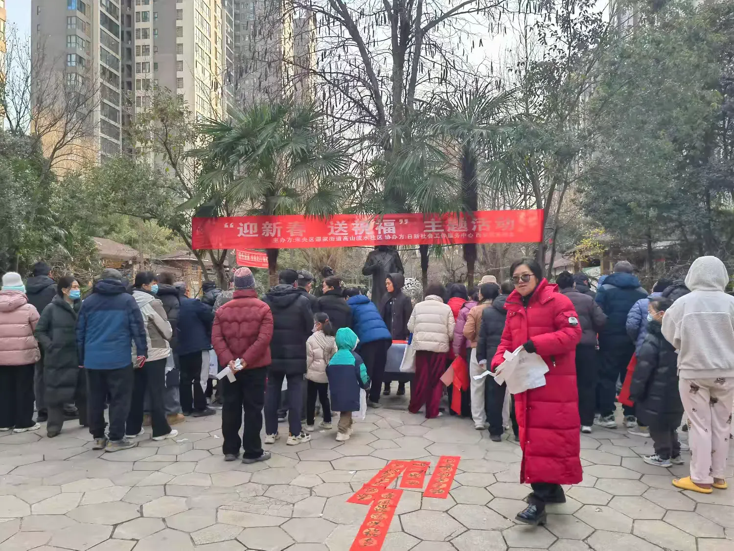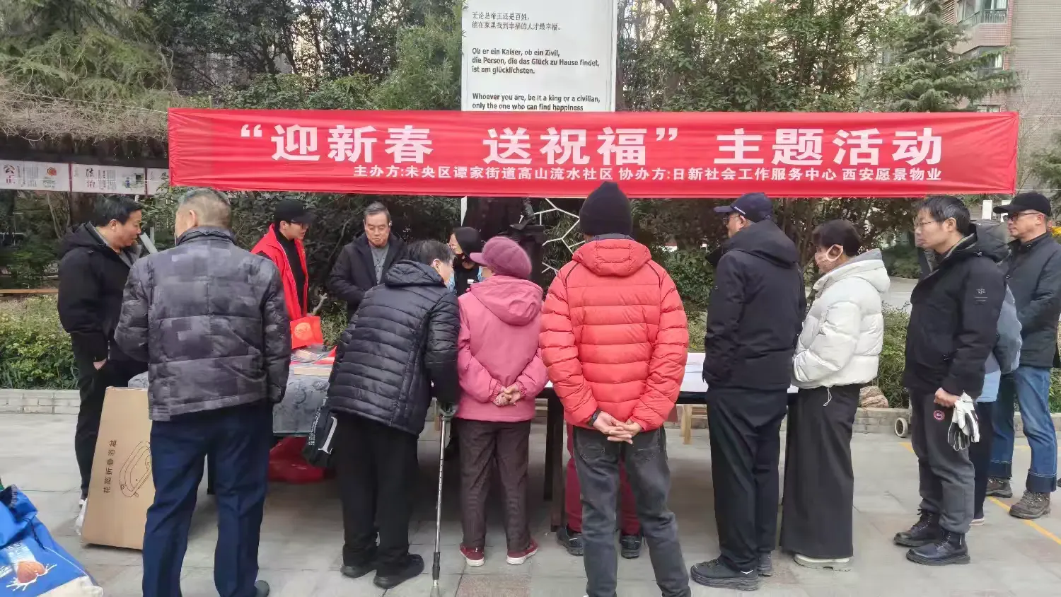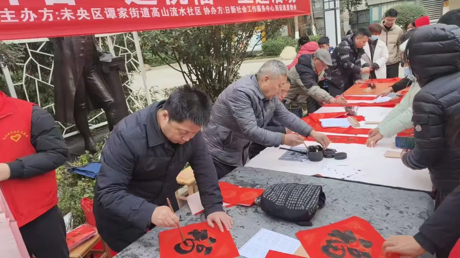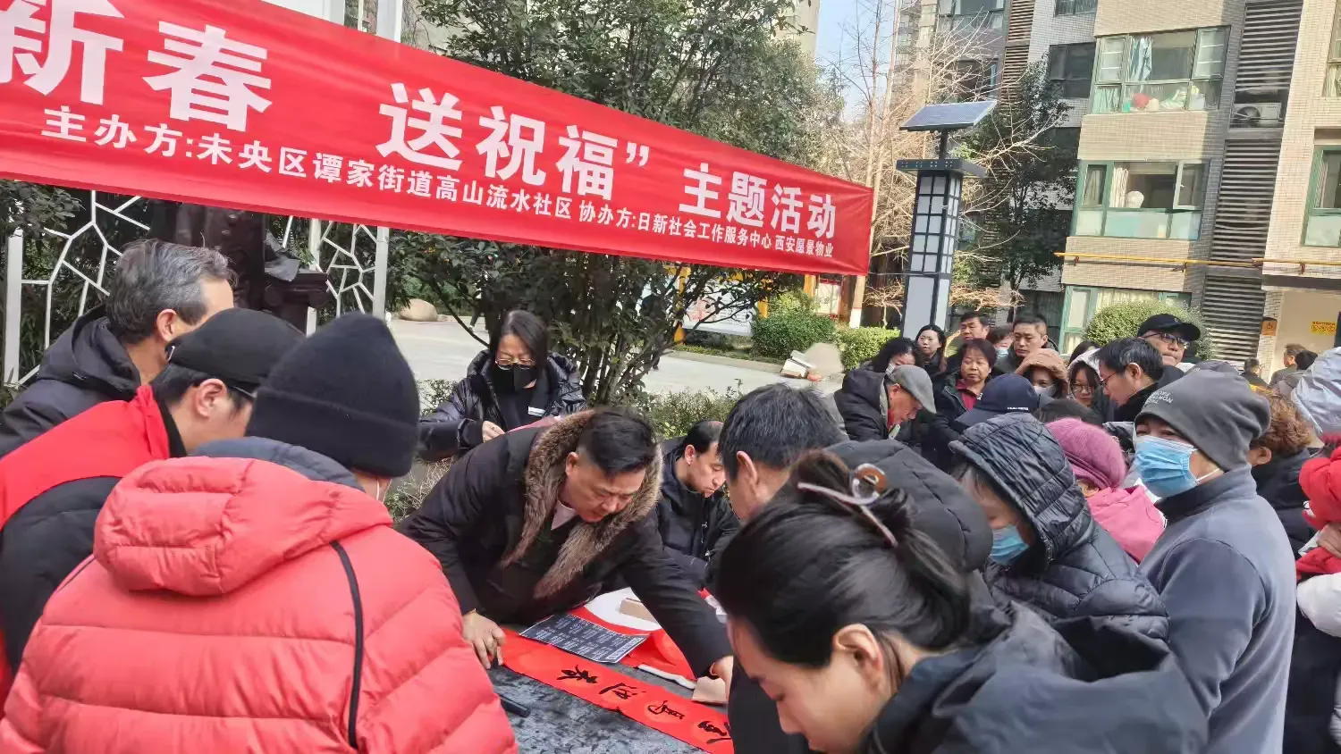 岁末元春,年味渐浓,为迎接丙午马年新春,高山流水社区主办,日新社会工作服务中心、西安愿景物业协办,在社区广场上举办了一场热闹非凡的“迎新春,送祝福”写春联、送春联活动。红纸如霞铺展,笔墨飘香四溢,社区资深书法爱好者挥毫泼墨,居民们踊跃参与写联、领联,在笔墨流转间定格邻里温情,让传统年味浸润人心。
